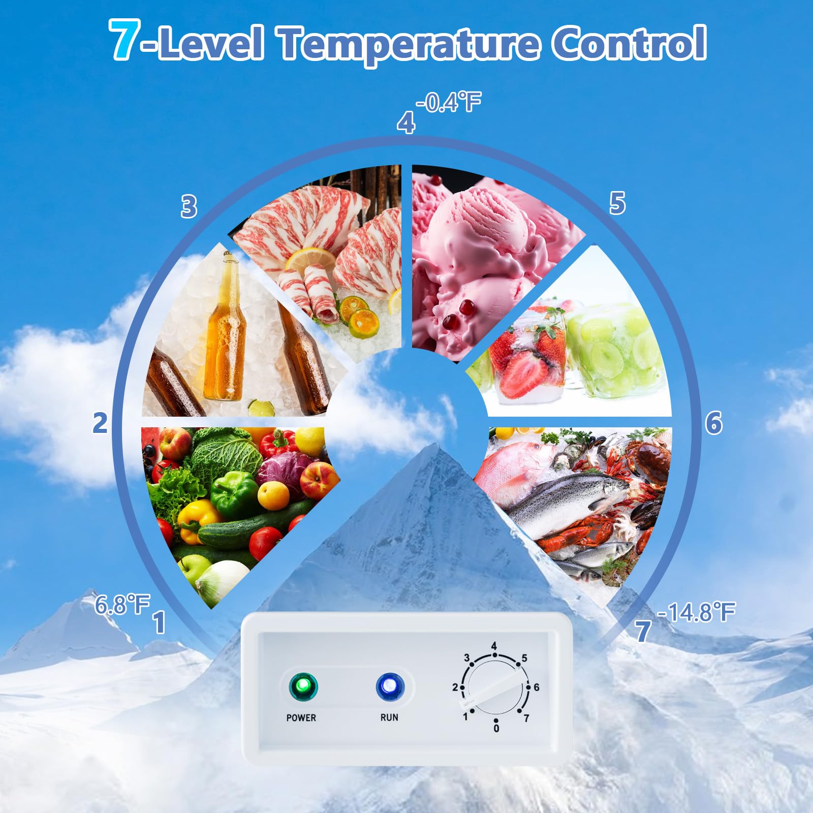 - ❄️ [7-Level Temperature Control] The adjustable thermostat is easy to set desired temperature to preserve the freshness and quality of food. 7-level temperature control ranging from 10°F to -11°F allows you to customize the freezing of different ingredients.