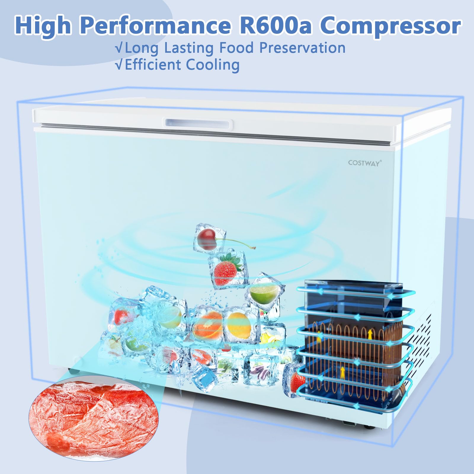 This 10 cu. ft. chest freezer provides ample space for storing a wide range of frozen goods. The 7-level adjustable temperature control allows you to set the ideal freezing temperature for your specific needs. Thanks to the high performance compressor, the freezer accelerate the cooling speed while minimizing electricity consumption, thus to reduce energy costs. No need to rummage through a cluttered freezer - simply lift the lid and retrieve what you need. More, the removable wire basket is included to keep small and commonly used items close at hand. Whether you need extra freezer space for home, business, or outdoor activities, this freezer is an efficient solution. For convenient use, 2 wheels and adjustable feet are at the bottom provide ease of transportation and keep balance on uneven ground.