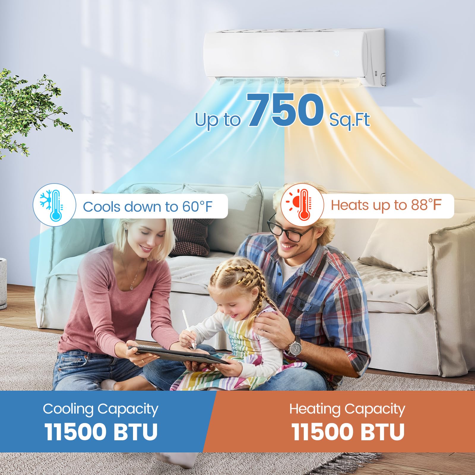 Experience ultimate temperature control in your space with this mini split AC. This 11500 BTU mini split air conditioner boasts 7 modes and 7 fan speeds, offering flexibility to keep areas up to 750 sq. ft. comfortably managed across various seasons. Featuring a 17 SEER2 rating and R32 refrigerant, this inverter AC unit aims to reduce energy costs and global warming potential. Thanks to the Wifi enabled design, you can effortlessly control your AC via the smartphone or voice commands through Alexa or Google Assistant. Besides, this mini split air conditioner and heater features a quiet sleep mode, 24-hour timer, 4D auto swing and handy remote control for convenient use.