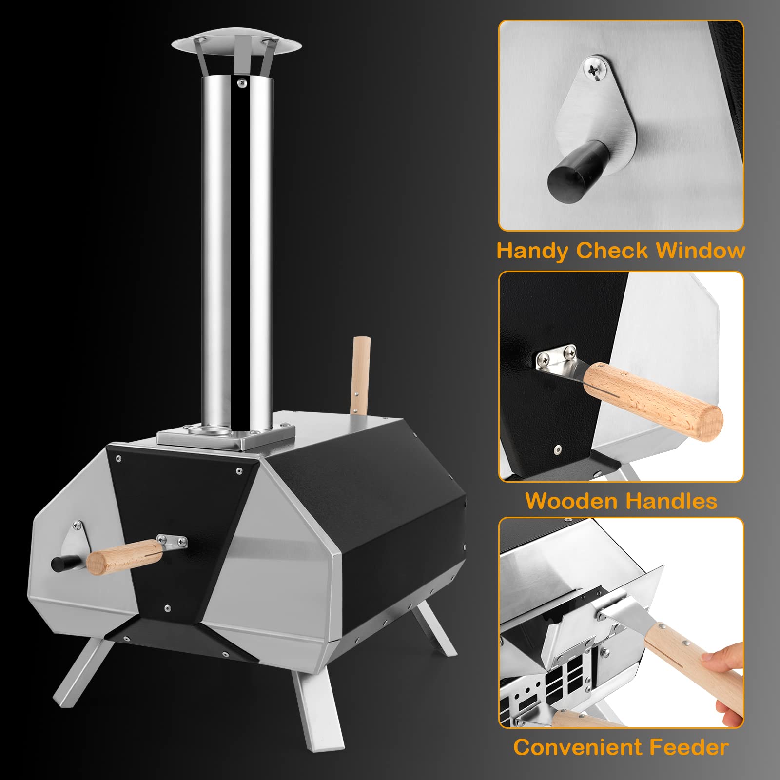 After preheating for 5-10 minutes, the pizza maker is ready to cook pizzas, steaks, breads, sausages or roasted chickens. It requires about 1-5 minutes to finish cooking, allowing you to immediately enjoy the delicious food with your family members. Premium stainless steel and isolating materials allow for long-term use. The pizza stove works with different fuels, like wood, briquette, pellet and coal. Meanwhile, the package contains all you need. Make the delicious pizza right now!