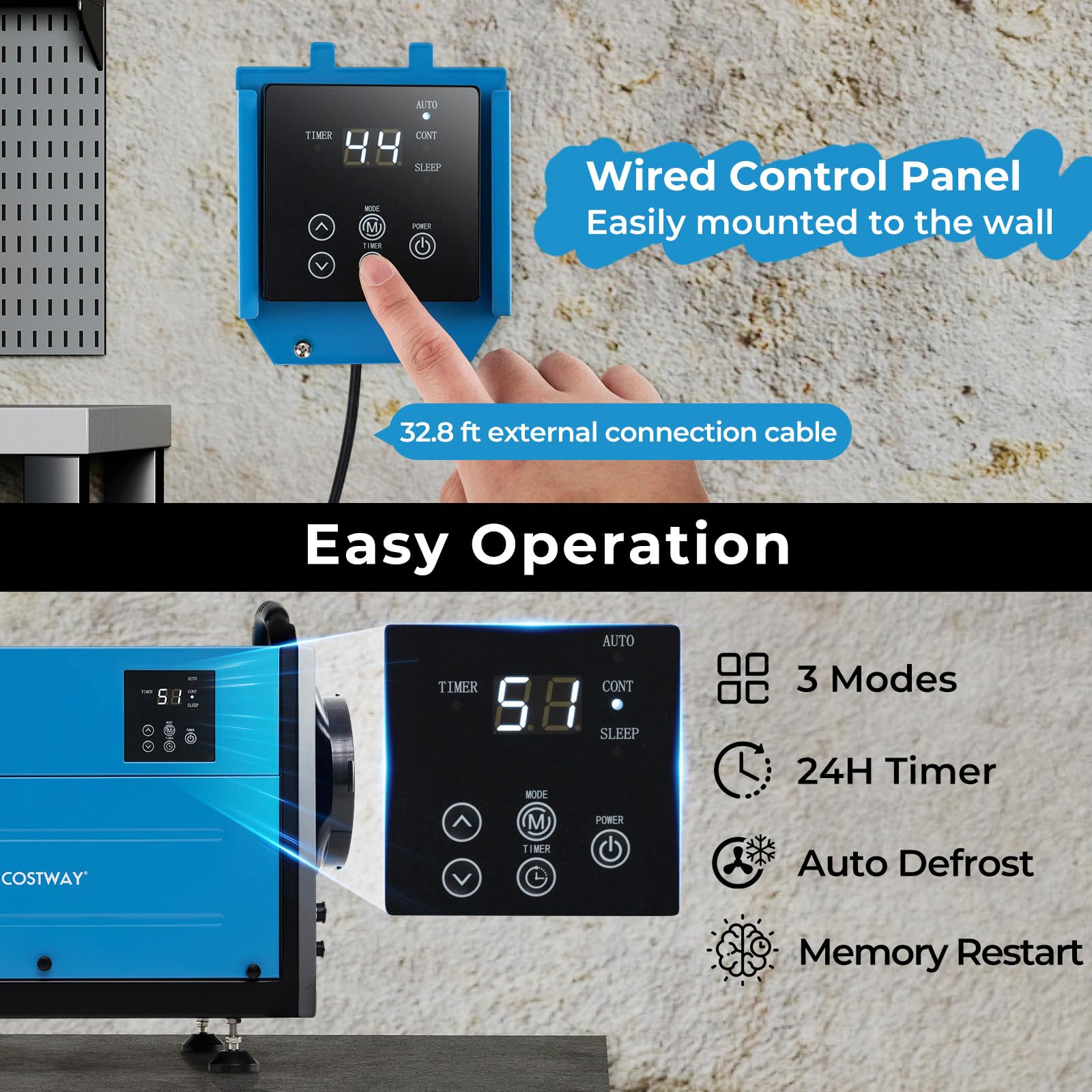 - Remote Wired Control: The smart control panel with clear LED display makes operation a breeze. Equipped with a 32.8 ft external connection cable, the control panel can also be mounted to the wall easily. This industrial dehumidifier is ideal for crawl spaces, construction sites, warehouses, basements, garages and more.