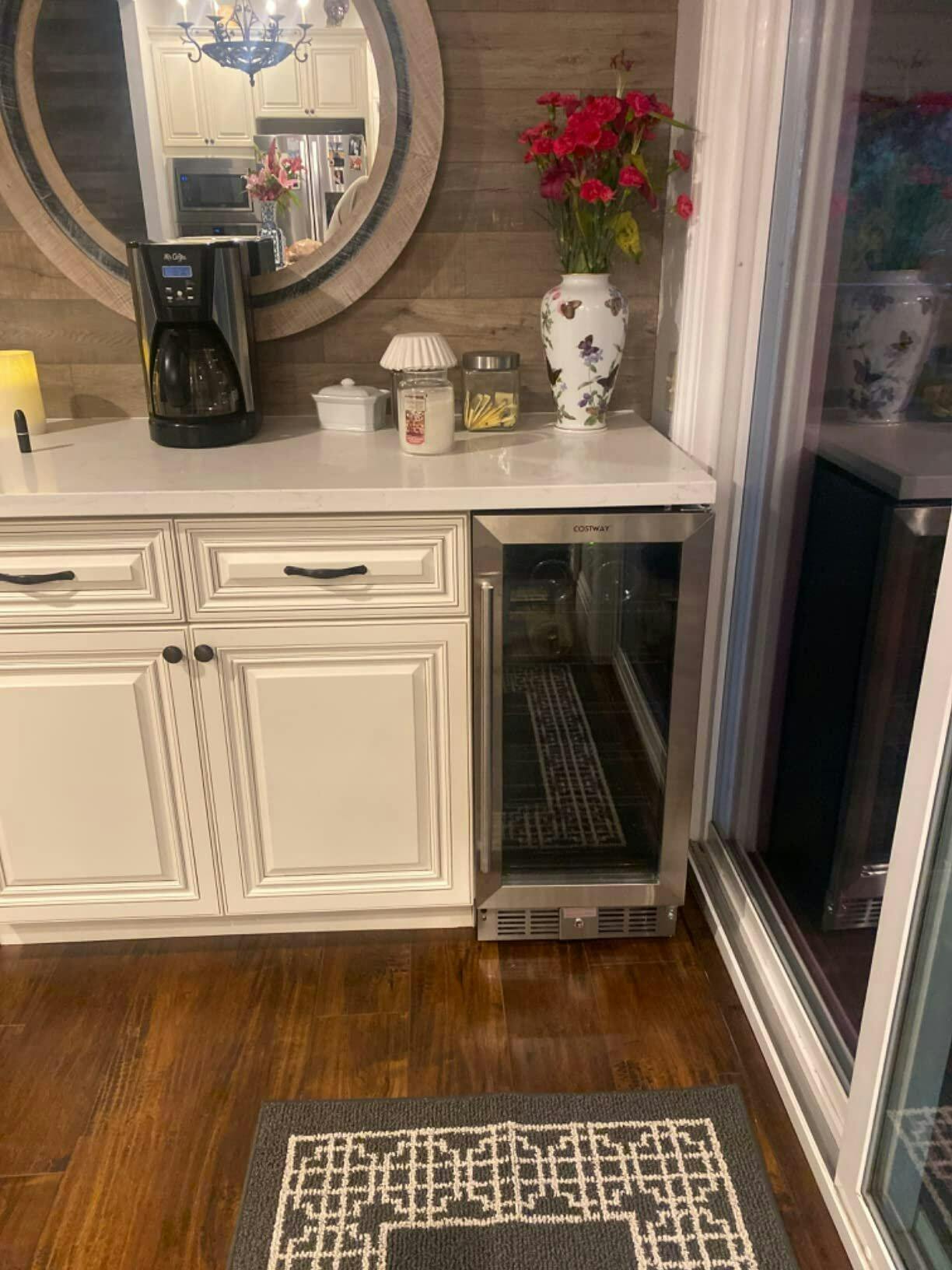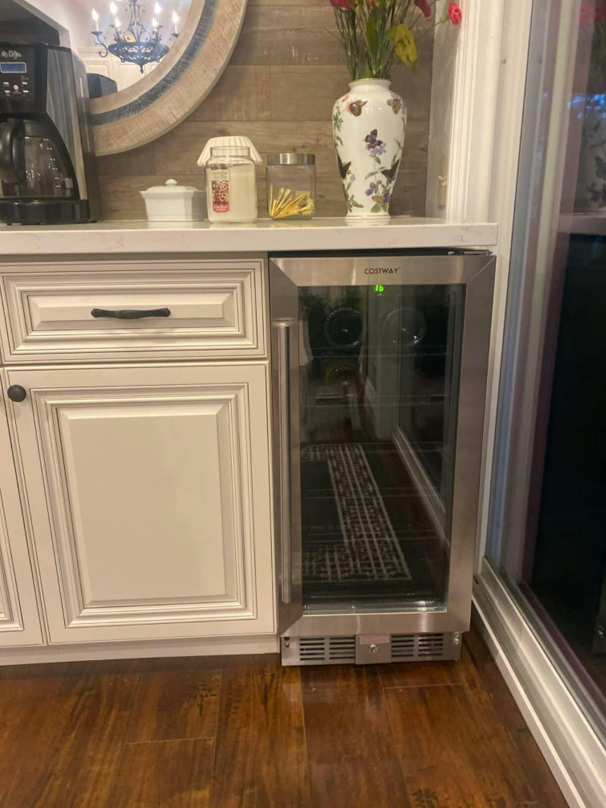 🍾【Built-in or Freestanding Installation】Our wine refrigerator adopts leveling legs to enhance its stability on the uneven ground. It can be placed under a countertop or just freely stand in your home, mini bars, etc. And the recommended inserting dimension is 15.5” x 23” x 34.5” (L x W x H). The auto lock also can save your wines and prevent the kids to get cold drinks by themselves.