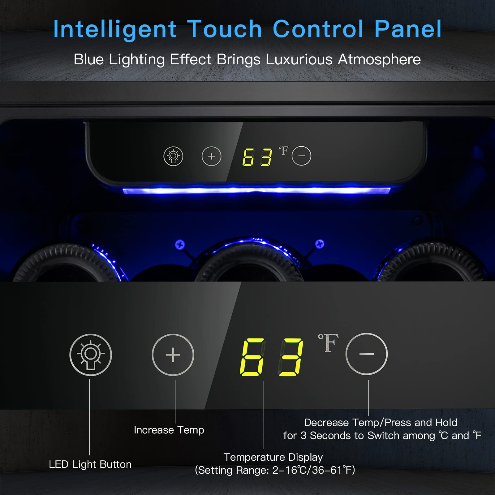 - 🍾【Smart Touch Panel & Memory Function】Our powerful wine cellar features a intuitive control panel that allows you to adjust its temperature from 36°F(2°C) to 61°F(16°C) for different beverages and wines. Sparking wine(41-46°F), dry/ white wine(48-53°F), red wine(59-63 °F). And the memory function makes sure the wine cooler stays the same setting, keeping your wines fresh all time. Plus, you can easily press the minus(-) button for 3 seconds to switch the temperature display between °C and °F.