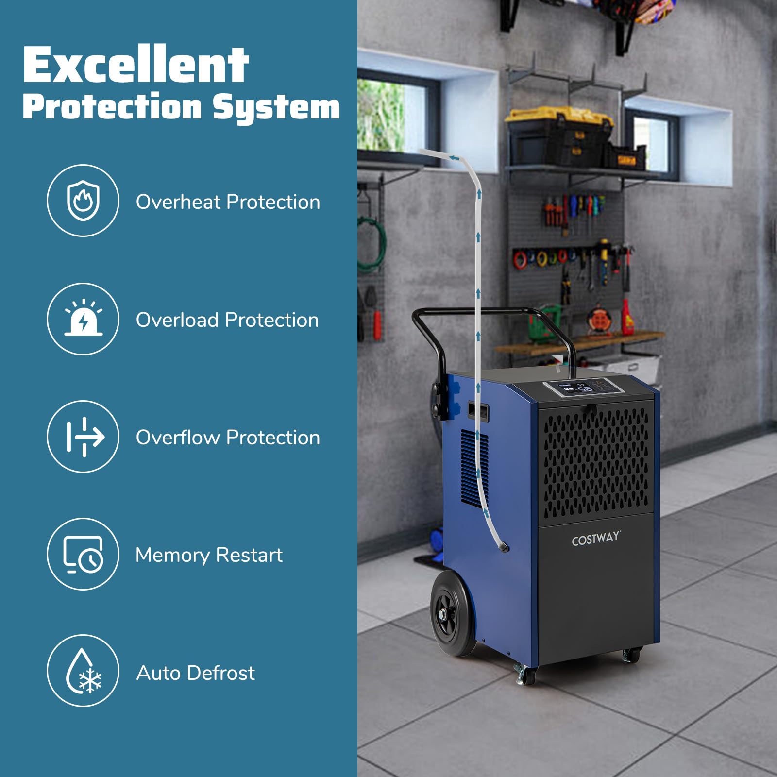 Smart humidity control and multiple drainage options ensure optimal performance and convenience. The user-friendly control panel and 24H timer offer ease of operation. Featuring robust protection systems and enhanced mobility, this dehumidifier is designed for durability and practicality.
