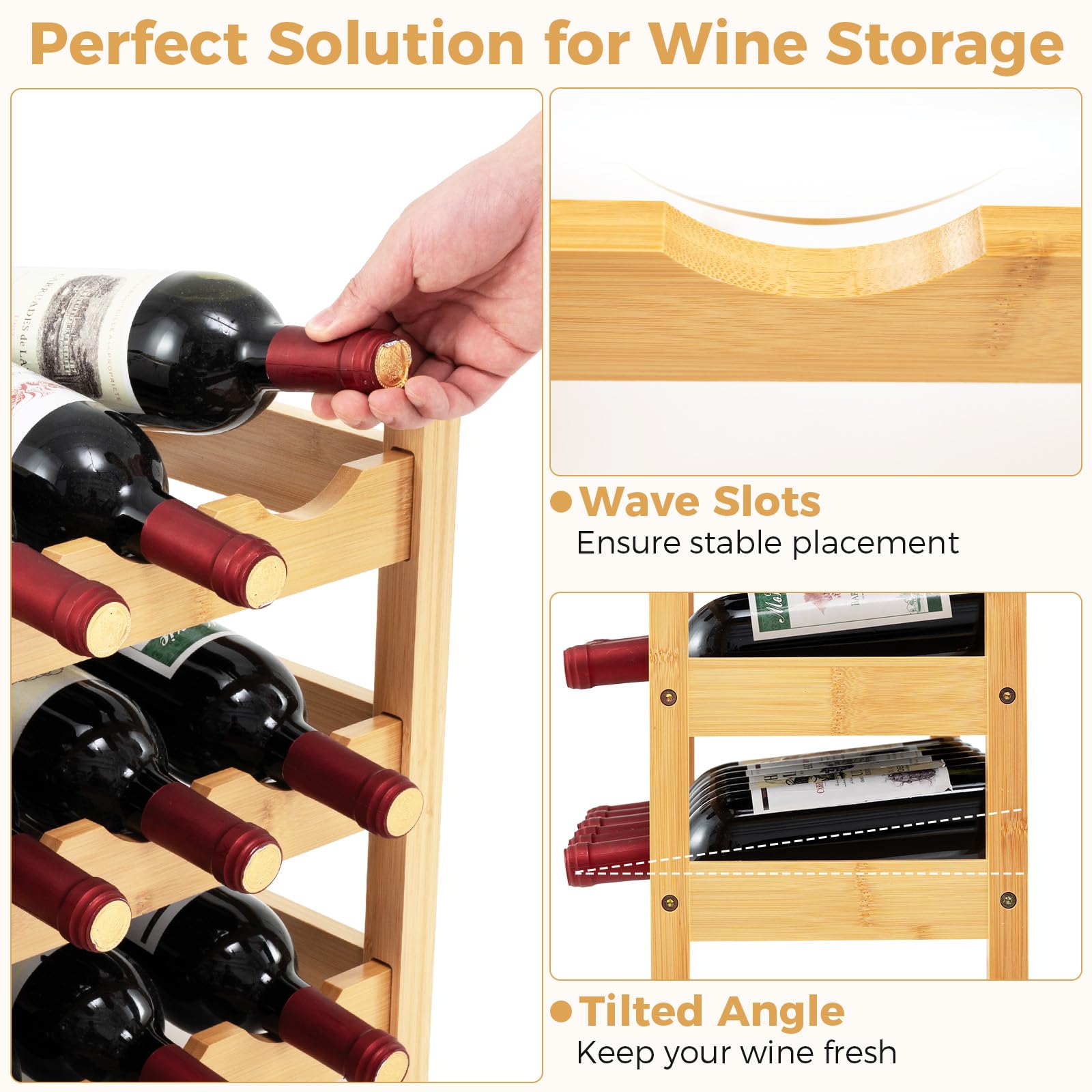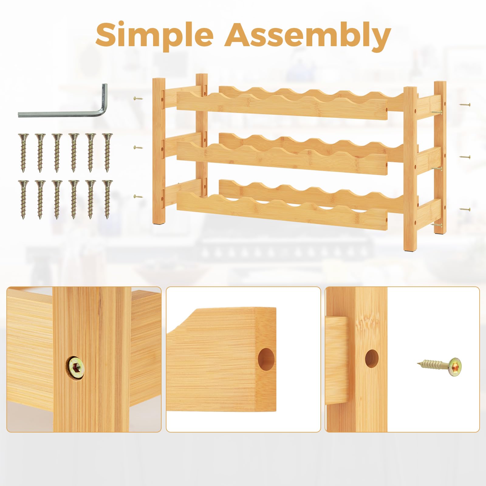 Made from 100% natural bamboo with PU coating, this sturdy and elegant rack is designed to withstand long-time use. With 3 tiers, the wine rack can hold up to 18 bottles. Each bottle rests in a meticulously crafted wave slot, making bottles tilted to maintain freshness. Its open structure ensures visibility and accessibility, while anti-slip footpads offer stability and surface protection. Whether you’re a casual collector or a wine connoisseur, this 18-bottle wine rack will be a perfect solution for wine storage, ensuring your favorite vintages are always ready to serve.