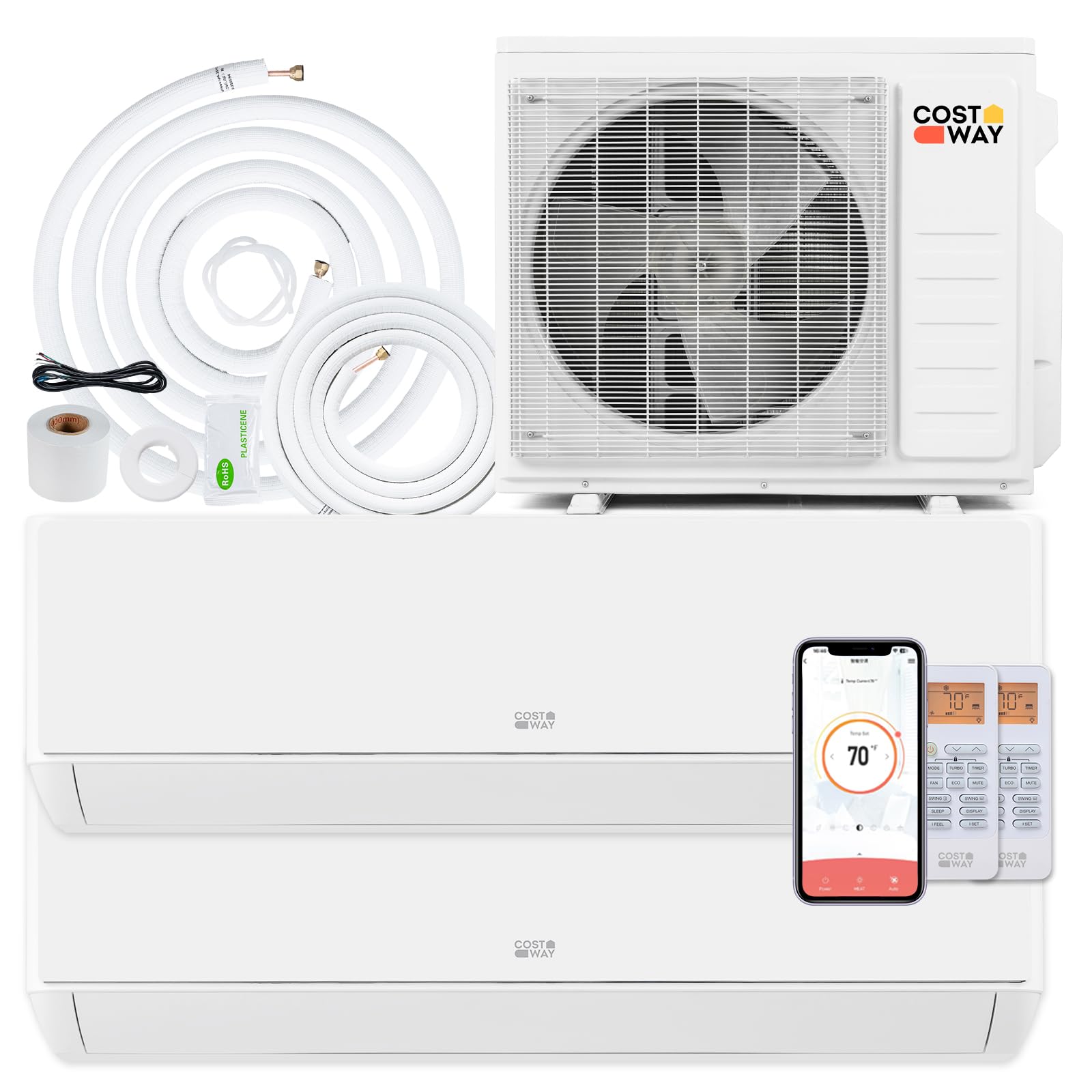 Enjoy all-season comfort with this 2 Zone 18000 BTU mini split air conditioner. This dual-zone energy efficient inverter split AC uses R454B refrigerant, supporting strong heating and cooling with lower energy waste. Built for demanding climates, the outdoor unit with chassis electrical heating cools even at 55℃/131℉, and heats even at -25℃/-13℉. It supports smart control via built-in WiFi, enabling operation through the app, included remote, or voice commands using Alexa and Google Assistant. You can choose from 7 modes and 8 fan speeds to suit changing seasons and comfort preferences. The 24-hour timer, 4D airflow, quiet operation and self-clean function enhance daily convenience.