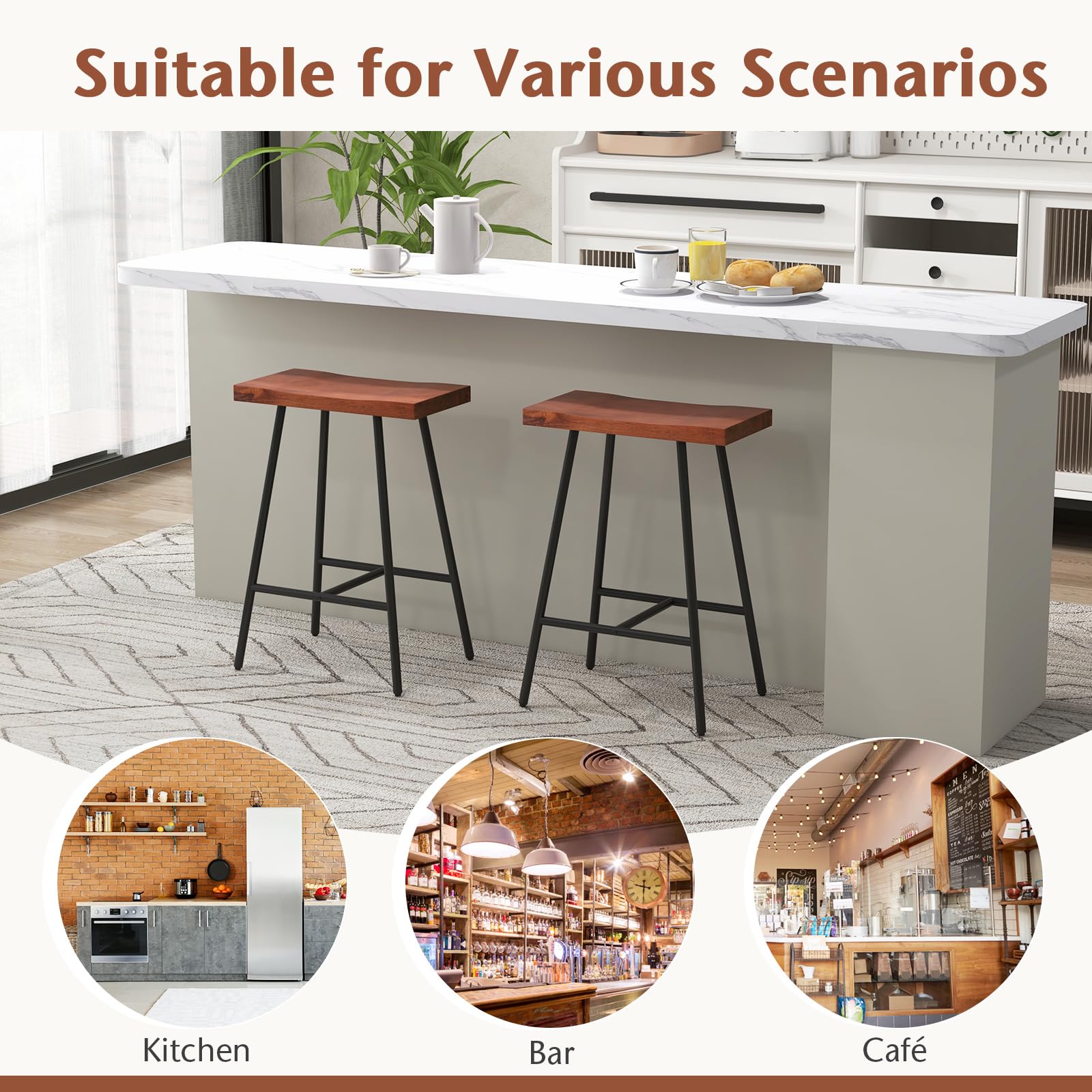 Durable rubber wood seat is wear-resistant and non-deforming 2-Step easy and quick assembly for convenience Stable and rust-proof metal frame with reinforced crossbars for durability Curved seat surface provides exceptional support to your hips Compact size allows for easy storage under the counter 7.5" convenient footrests relax your feet Ergonomic design for maximum comfort during extended periods of sitting Versatile design suitable for various scenarios such as kitchen, bar, or cafe