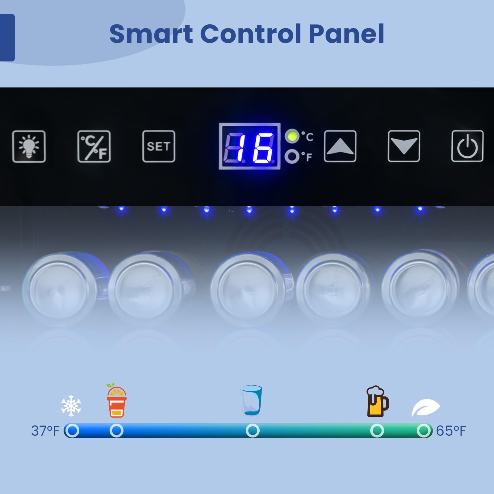 - 🍷【Powerful Circulation Cooling System】Our beverage fridge features a low noise compressor (37 dB) and 2 premium fans to achieve circulating cooling effects. It can quickly and evenly chill your sodas, water, beers or wine. Smart control panel ensures easy temperature from 37°F to 65°F. The auto defrost function works every 4 hours to bring you convenience in cleaning.