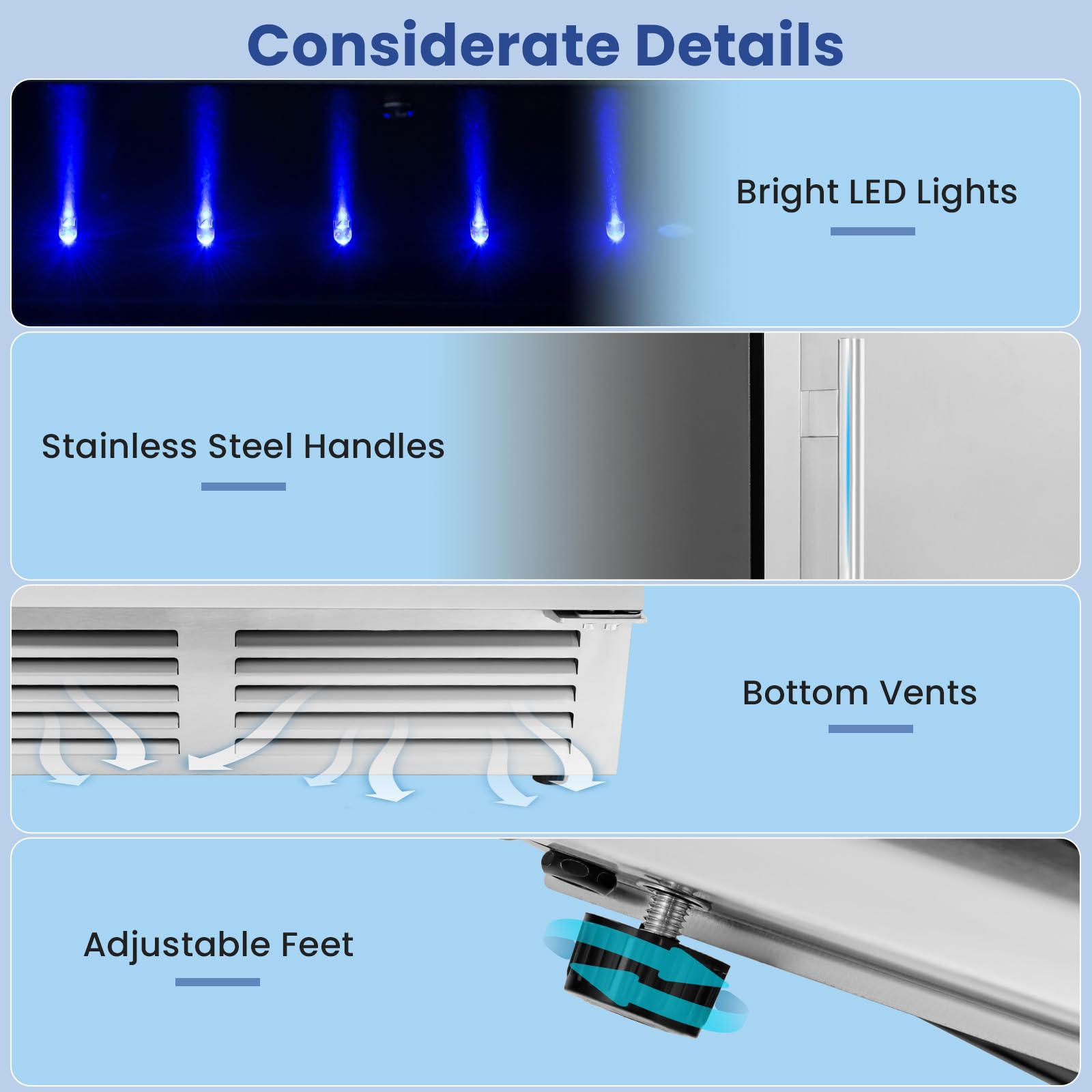- 🍷 【Built-in or Freestanding Installation】With a compact size of 23.4” x 22.6” x 34.3” (L x W x H), the under counter beverage refrigerator can be built in the cabinet or just stand in your home, mini bars, etc., while its adjustable foot pads provide extra stability on uneven ground. It’s recommended to have a space of at least of 2” from the back to the wall and 4” from the side to the wall.