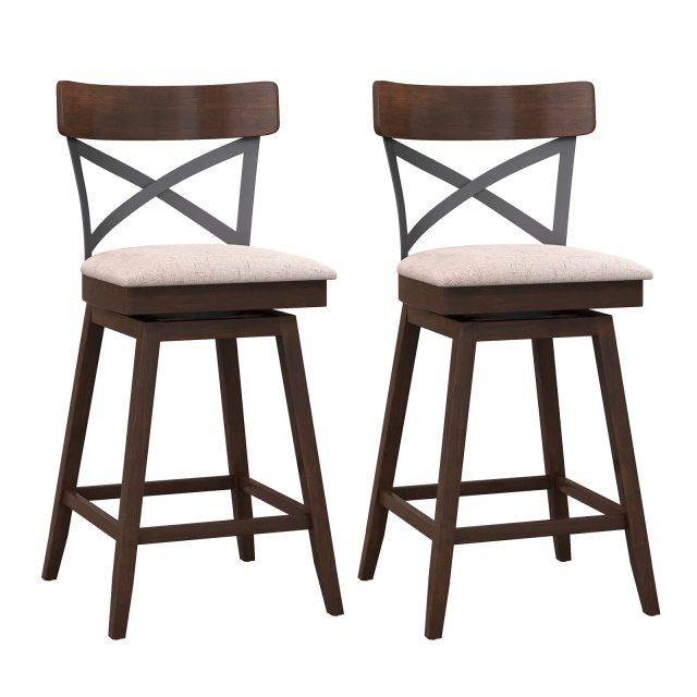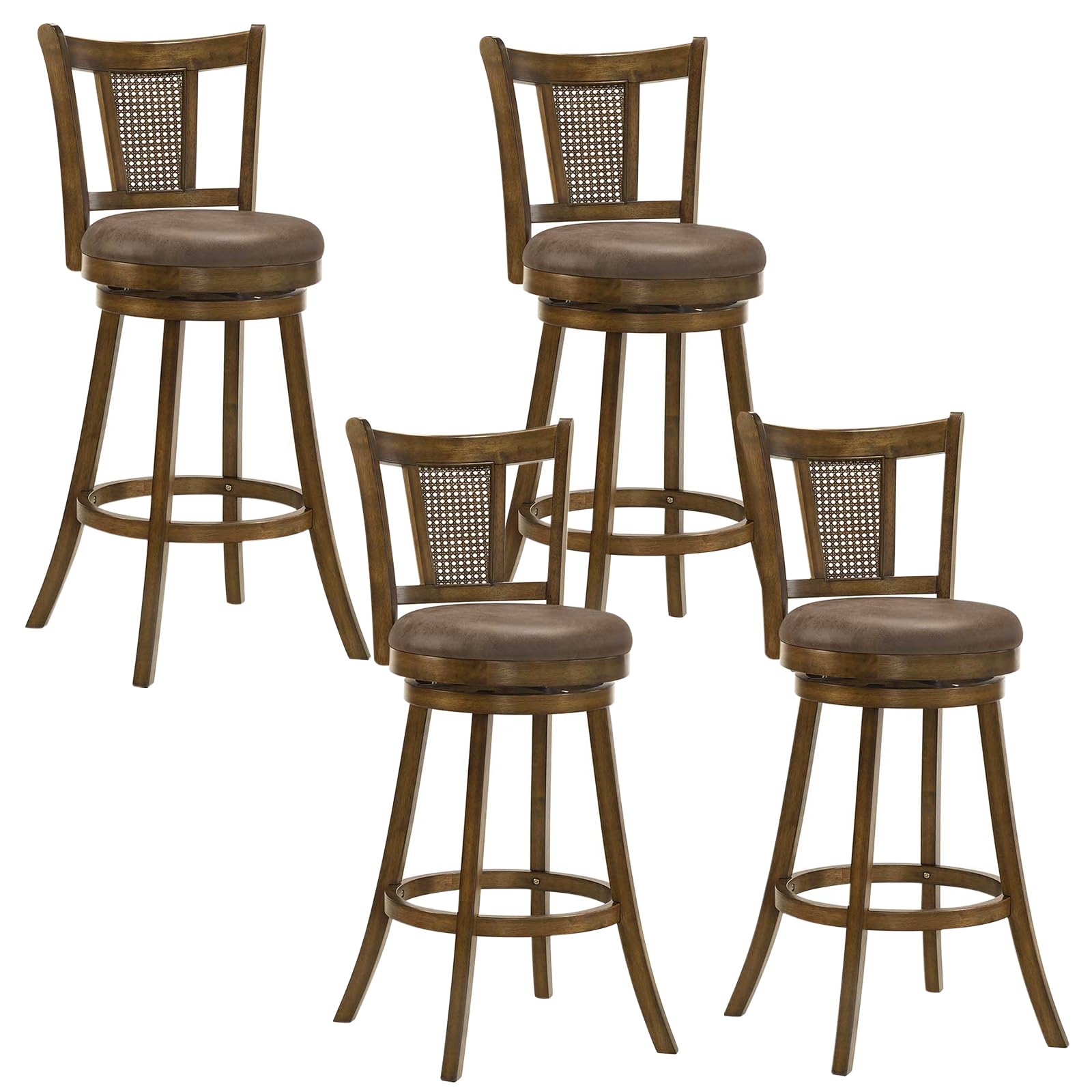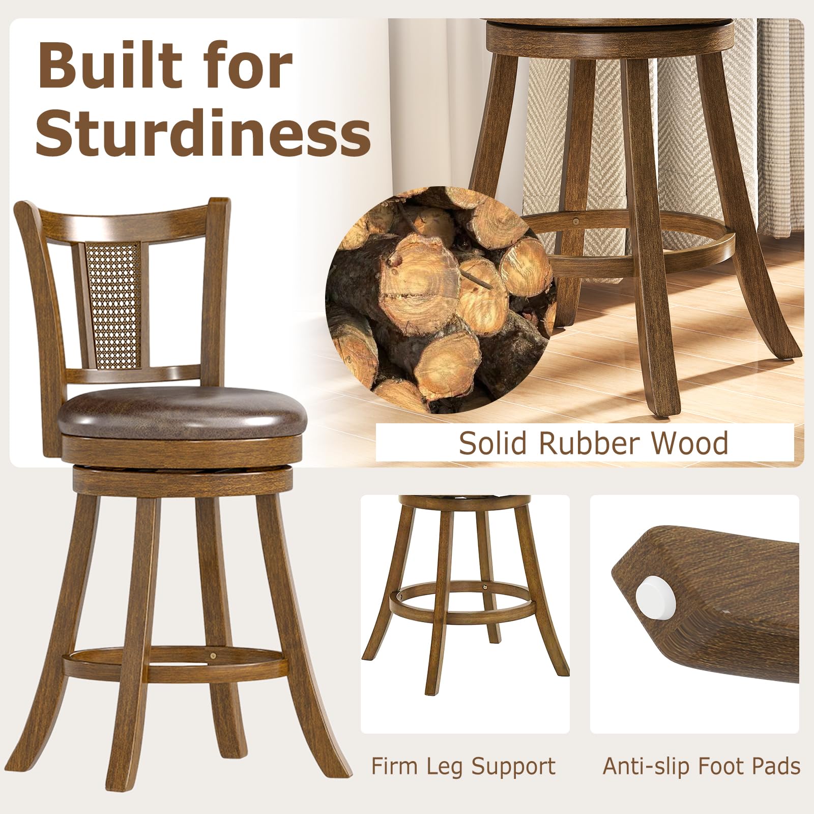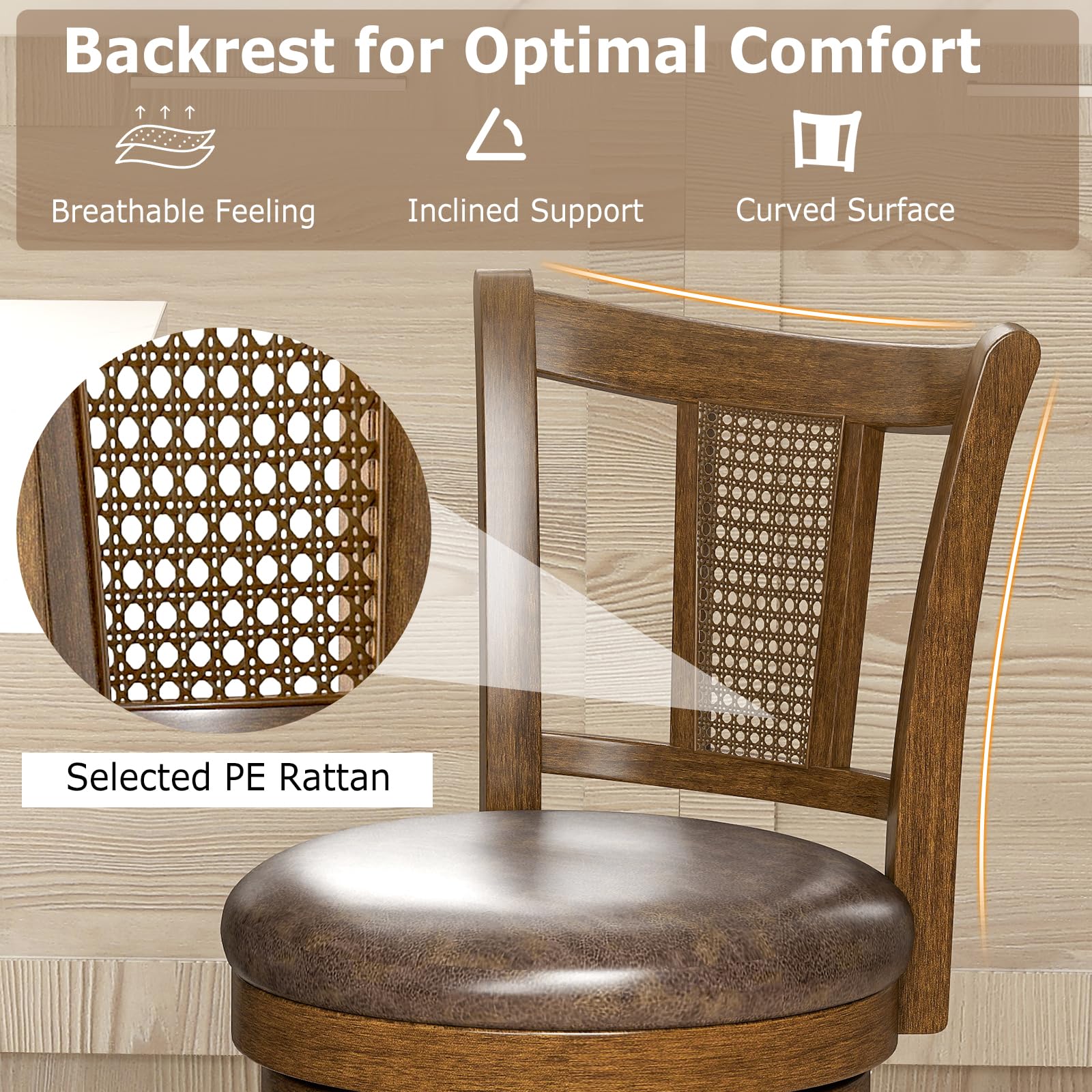 Enjoy swivel comfort and rustic elegance with our counter stools. These swivel counter stools allow 360° free rotation for social settings. Meanwhile, their seats feature skin-friendly and easy-to-clean high tech fabric as well as high-density sponge, providing optimal comfort. The backrests with inclined support and curved surface offer hours of sitting without fatigue. Their central PE rattan panels promote ventilation for your coziness. Additionally, crafted from solid rubber wood, these rotating stools boast great sturdiness, holding up to 400 lbs. They are equipped with firm leg support and anti-slip foot pads, ensuring stability for your peace of mind.