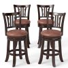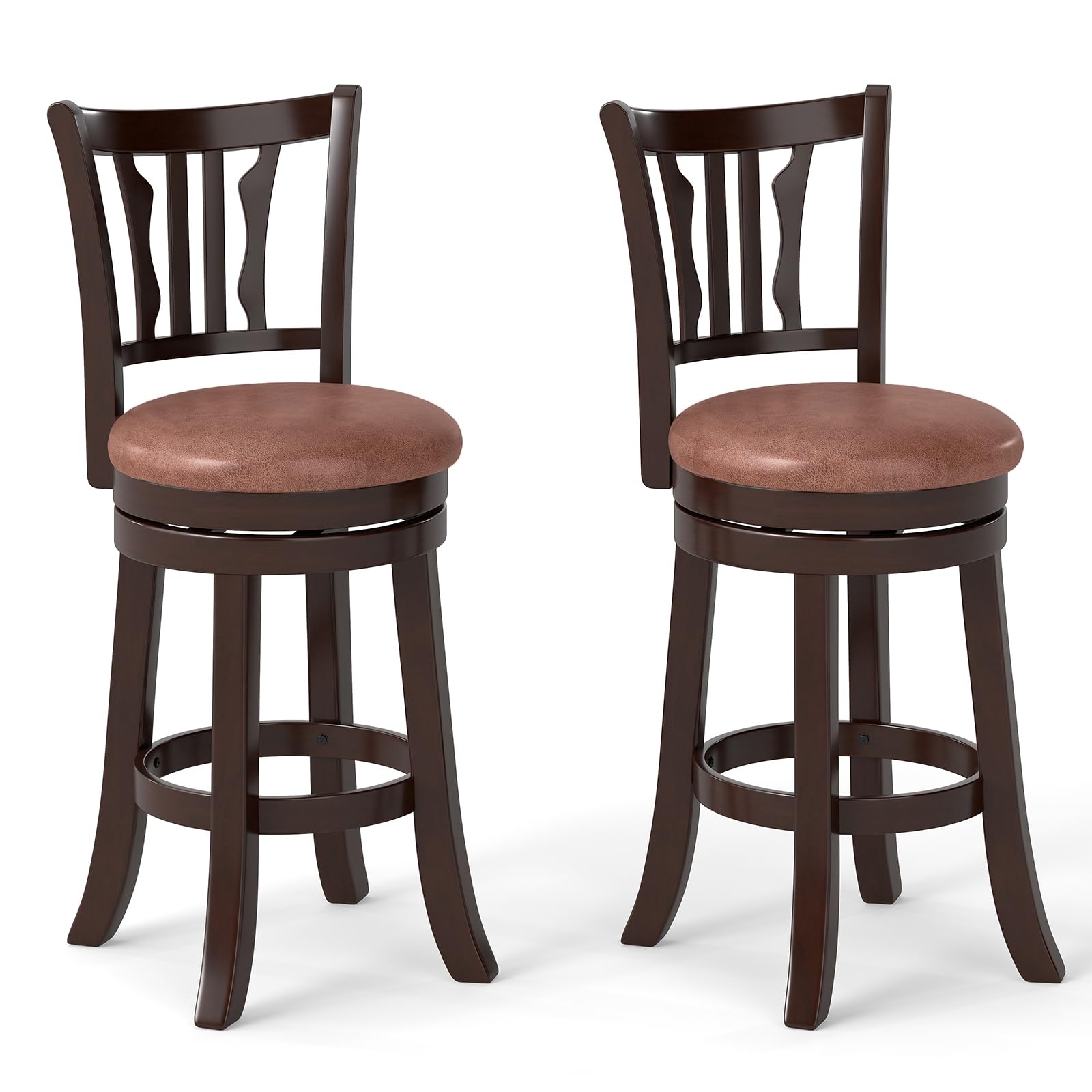 Featuring premium rubberwood structure, these high-top chairs can support up to 400 lbs, ensuring high stability and long-time use. The cozy padded seat consists of faux leather, soft sponge, premium MDF and non-woven fabric, combining luxury with practicality. 360° swivel functionality adds versatility, allowing for easy rotation and engaging interactions. Designed with an ergonomic backrest and a footrest, these stools ensure prolonged comfort and support. With classic design, these well-crafted barstools enhance any kitchen, dining room, or home bar by creating a cozy and stylish atmosphere.