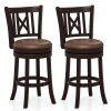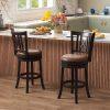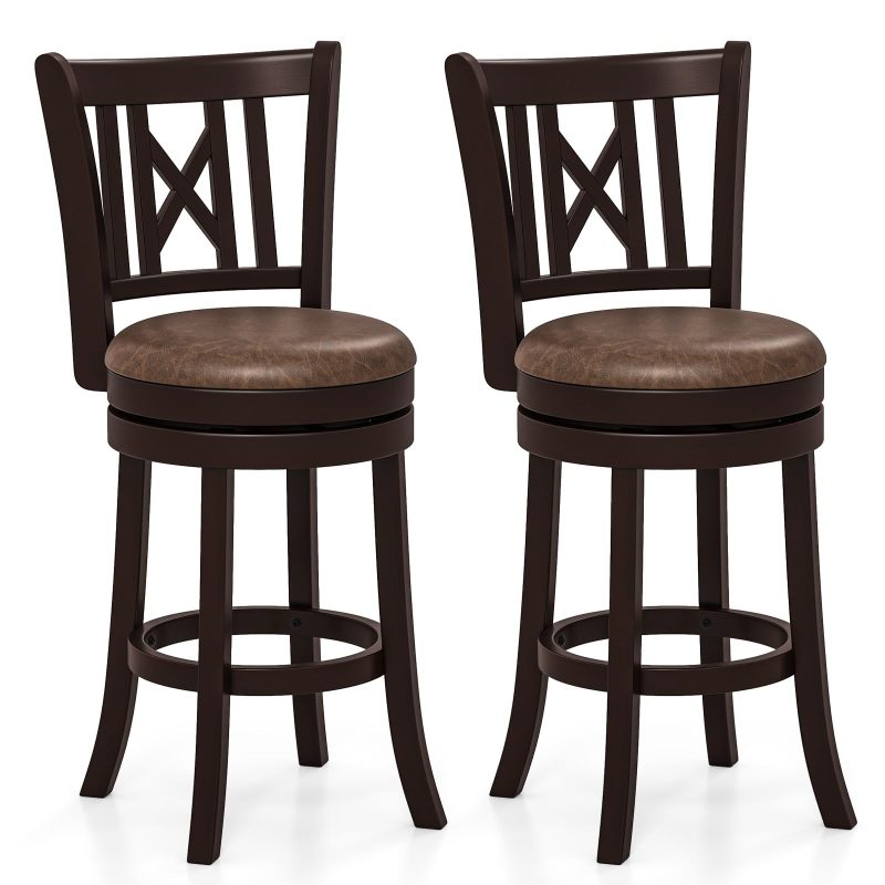 The inclined, contoured backrests provide ergonomic support and an attractive hollowed design, while the sponge-padded seats provide a cozy experience with breathable leathaire upholstery. Constructed with sturdy rubber wood frames and supportive splayed legs, these bar chairs ensure stability and can accommodate a large load. The footrests allow for comfortable leg stretching. Moreover, the swivel seat design makes it convenient for you to converse with friends around you. Perfect for kitchens, dining areas, home bars, restaurants, or pubs, these versatile 26” bar stools fit seamlessly under tables ranging from 35” to 39” in height.