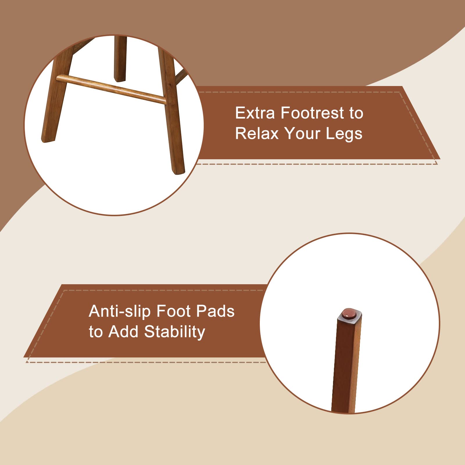Our 2 pcs backless bar stools feature 360-degree swiveling seat, allowing you to easily change direction during sitting to chat with friends. Besides, the sponge padded seat cushion enables you to sit comfortably even after long-term sitting. Its premium linen fabric is also comfortable to touch. Plus, the footrest design increases its seating comfort. You can put them in the kitchen, dining room or home bar to enjoy leisure time with your family members. Meanwhile, made of solid rubber wood, the bar stools are strong and durable enough to provide long-term use.