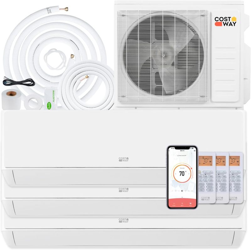 Enjoy all-season comfort with this 3 Zone 27000 BTU mini split air conditioner. This tri-zone energy efficient inverter split AC uses R454B refrigerant, supporting strong heating and cooling with lower energy waste. Built for demanding climates, the outdoor unit with chassis electrical heating cools even at 55℃/131℉, and heats even at -25℃/-13℉. It supports smart control via built-in WiFi, enabling operation through the app, included remote, or voice commands using Alexa and Google Assistant. You can choose from 7 modes and 8 fan speeds to suit changing seasons and comfort preferences. The 24-hour timer, 4D airflow, quiet operation and self-clean function enhance daily convenience.