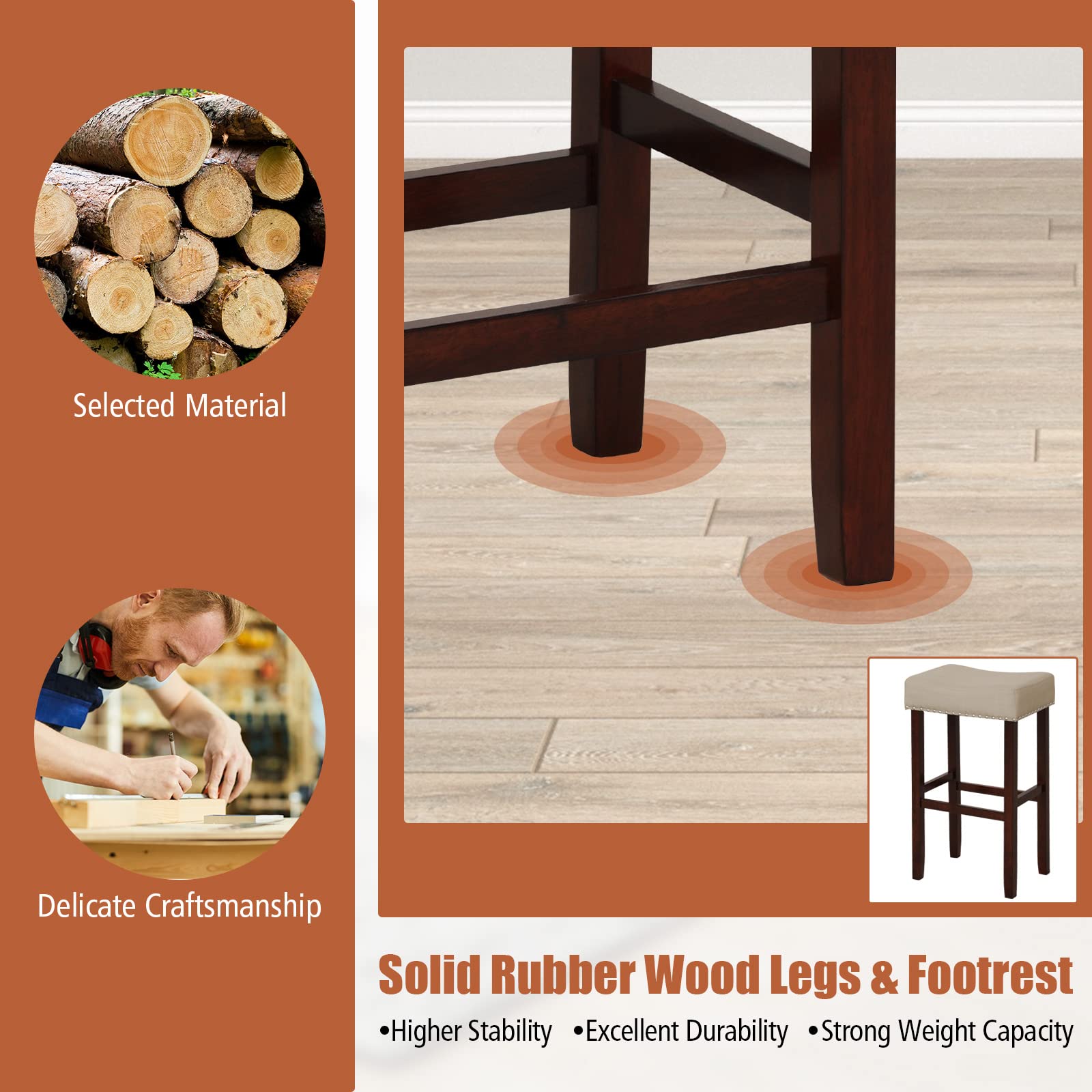 The saddle bar chairs are really gorgeous, elegant and comfortable! Thick sponge upholstered curved seat and durable linen fabric surface offer a sense of comfort even sitting for a long period of time. Moreover, supported by high quality rubber wood frame, the bar stool set is not easy to wobble or shake. The exquisite nailhead trim decoration, sleek and clean lines make the saddle stool set an aesthetically-pleasing piece for various places, which is suitable for dining room, kitchen or bar.