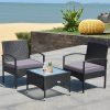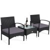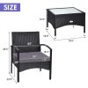 Our 3 PCS patio wicker rattan furniture set can make your outdoor living become better. Made of premium rattan and sturdy steel materials, the chair is stable enough to hold around 330 Ibs weight. Thickened cushions will give you a comfortable seating experience and you will feel that your body has loosened up a bit. Because the whole frame is lightweight, you can easily transport the chair to the yard or beside a swimming pool. Put some drinks and snacks on the table which equipped with a milky white tempered glass and sit on the chair, you can talk with your relatives and your family or just to have a great relax. The cushions are covered with waterproof polyester cloth which is durable and east to clean. Installation is quite easy and speedy with all the all the accessories are provided.FeatureDurable and sturdy rattan and steel materials for long service time Thick sponged cushion is soft and the cover is washable Weatherproof materials ensure the furniture set to be placed outside all year around Coffee table has a tempered glass top that is solid and easy to clean Good load bearing capacity which can up to around 330 Ibs Rattan set is light enough for you to carry and transport Ample tabletop space for serving drinks, snacks and fruits Ideal for placing in patio, yawn, garden, backyard and indoor Easy to install with detailed instructions