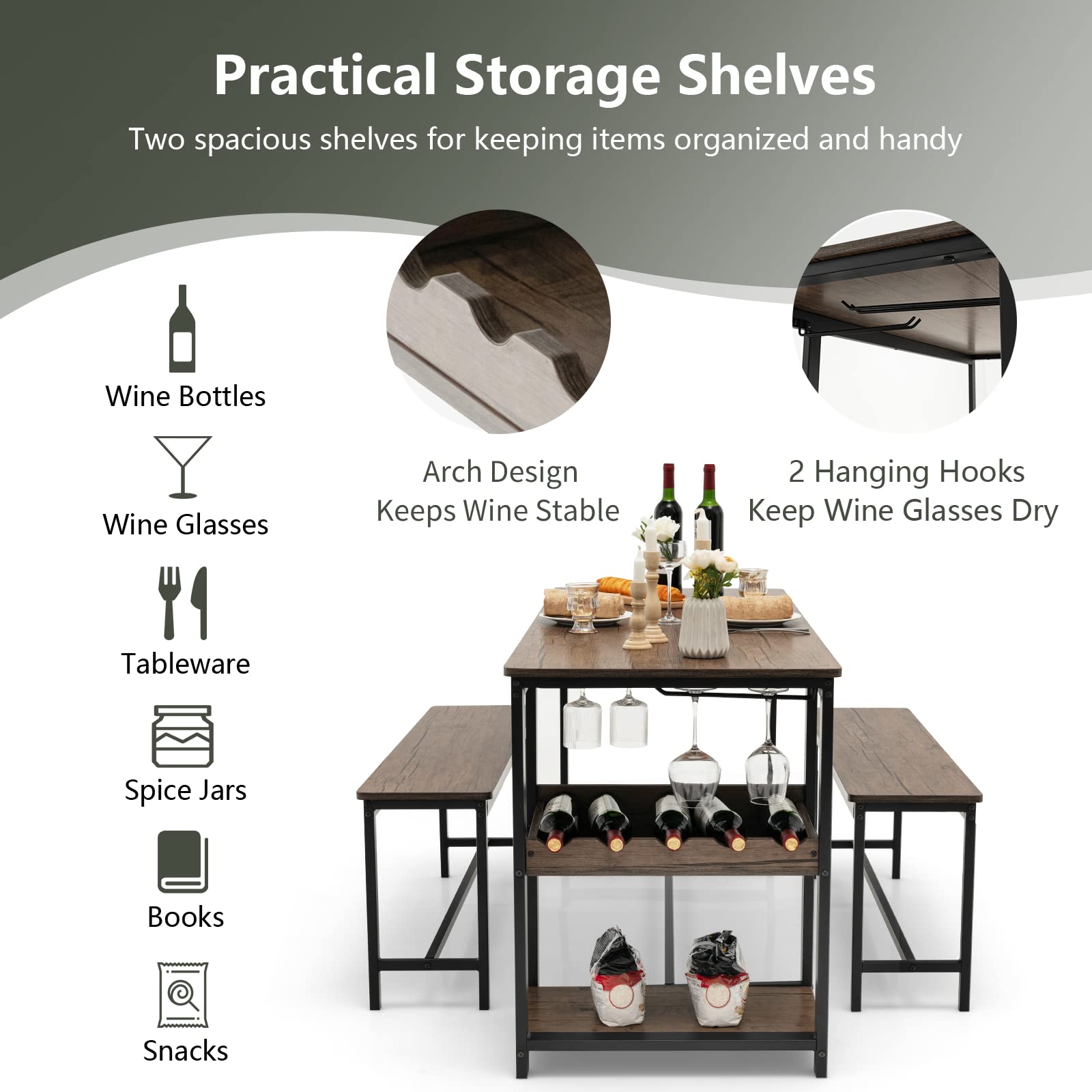Rustic Kitchen Dinner Table with 2 Benches, Wine Rack, Glass Holder and Storage Shelf.