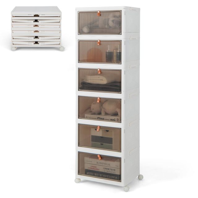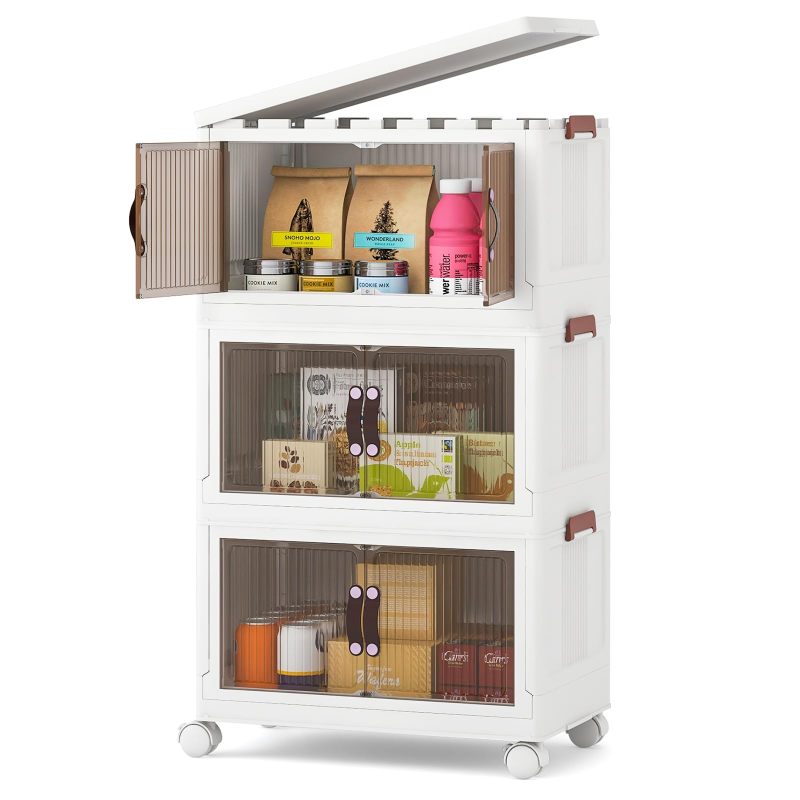 After simple assembly, you can choose how to arrange these storage boxes thanks to the stackable design. Each storage container features magnetic doors to access your items easily. And the top lid provides another way to take items. Moreover, the 25.5/60 gallon capacity offers roomy storage space to keep your space tidy and clean. These storage containers feature 4 universal casters (2 with brakes) and 4 mini wheels that allow for easy movement. If you do not need these stackable storage organizers, just fold them for easy storage and space-saving.