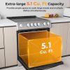 This electric ceramic range comes equipped with a spacious 5.1 cu. ft. oven, including 7 rack positions and a removable wire rack, ensuring ample space for any cooking endeavor. It features an advanced convection system with robust 1500W and 2000W heating elements that distribute heat evenly, alongside flexible cooking modes for baking, broiling and roasting. Additionally, the ceramic cooktop, complete with 4 high-efficiency burners, offers versatile temperature control for anything from simmering to boiling. Enhanced by a see-through door and bright oven light that allow for easy monitoring, this range also promotes safety and ease with a residual heat indicator for the cooktop and a smooth enamel interior, simplifying the cleaning process.