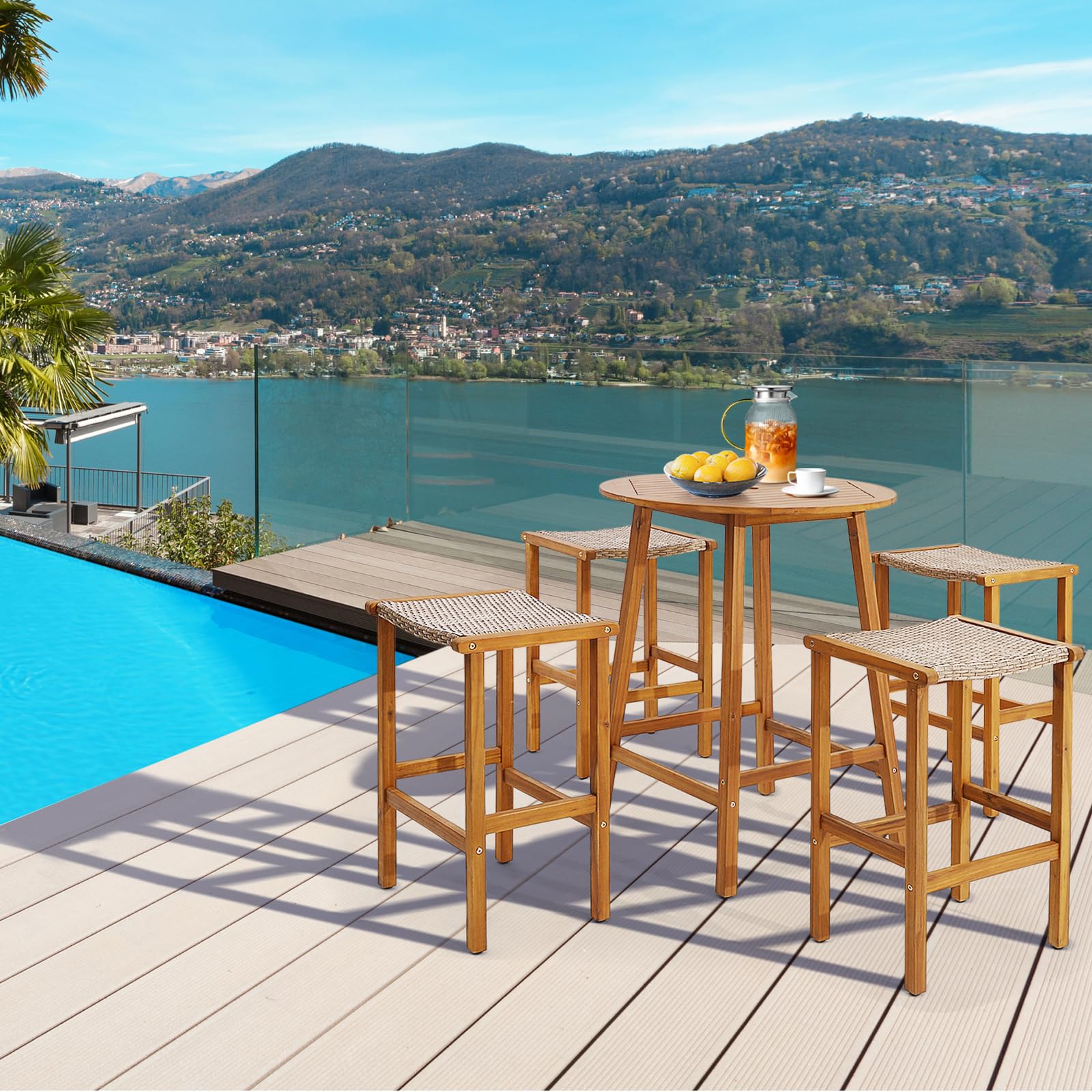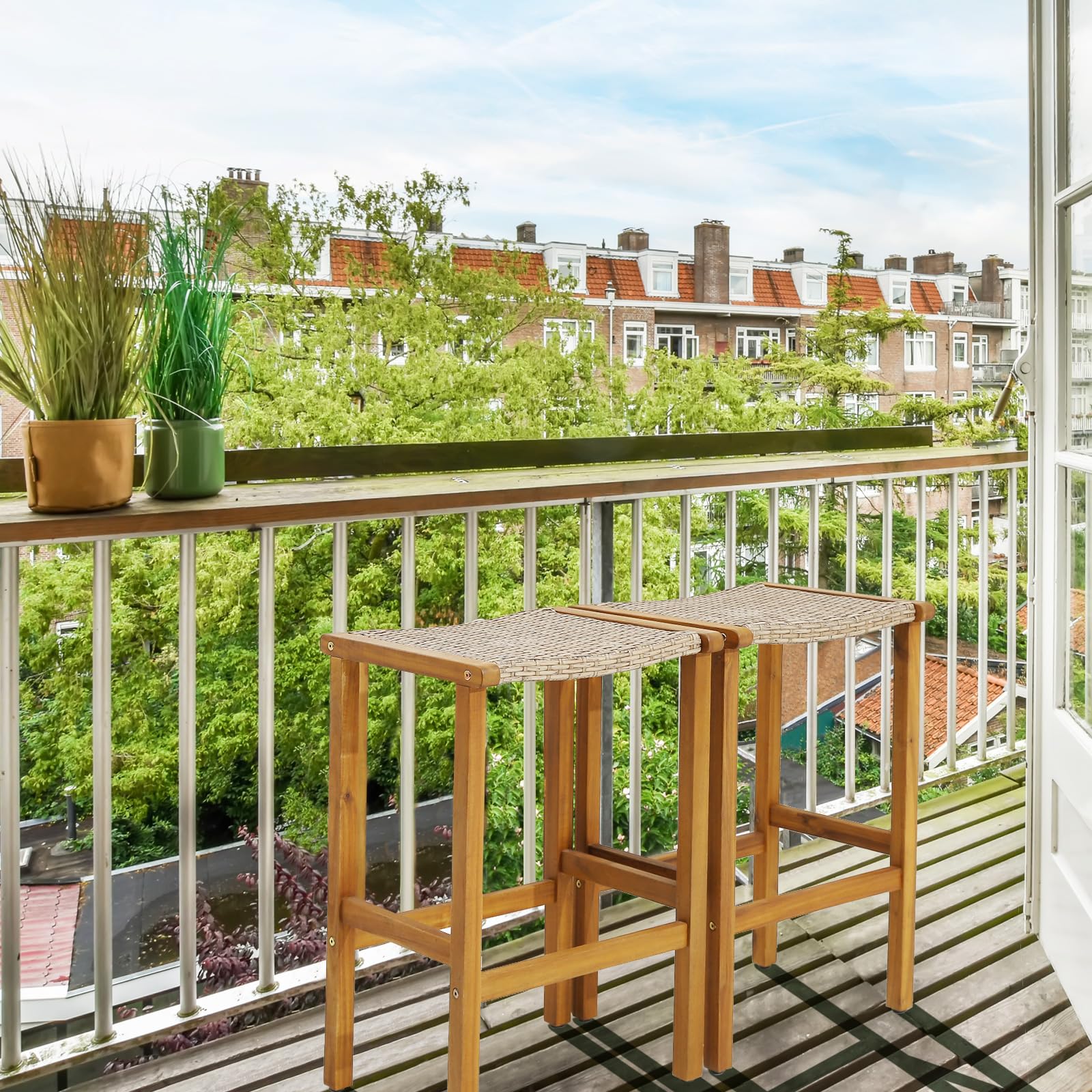 The patios furniture set includes 2 bar stools. The curved seat brings you a comfortable relax time when seat on this patio stool. You can rest your feet on the footrests as needed. In addition, made of high quality PE wicker and supported by acacia wood frame, this bar height stool set is durable and sturdy for years to come. Each bar stool is upgraded with adjustable foot pads to ensure the even legs while assembled. With their 30β seat height, from ground to seat, these wood bar stools can be used for any standard bar table. This set of 2 stools will be a beautiful addition to your backyard, patio, or balcony. Get some fresh air and enjoy your meals/drinks on these patio stools.