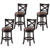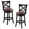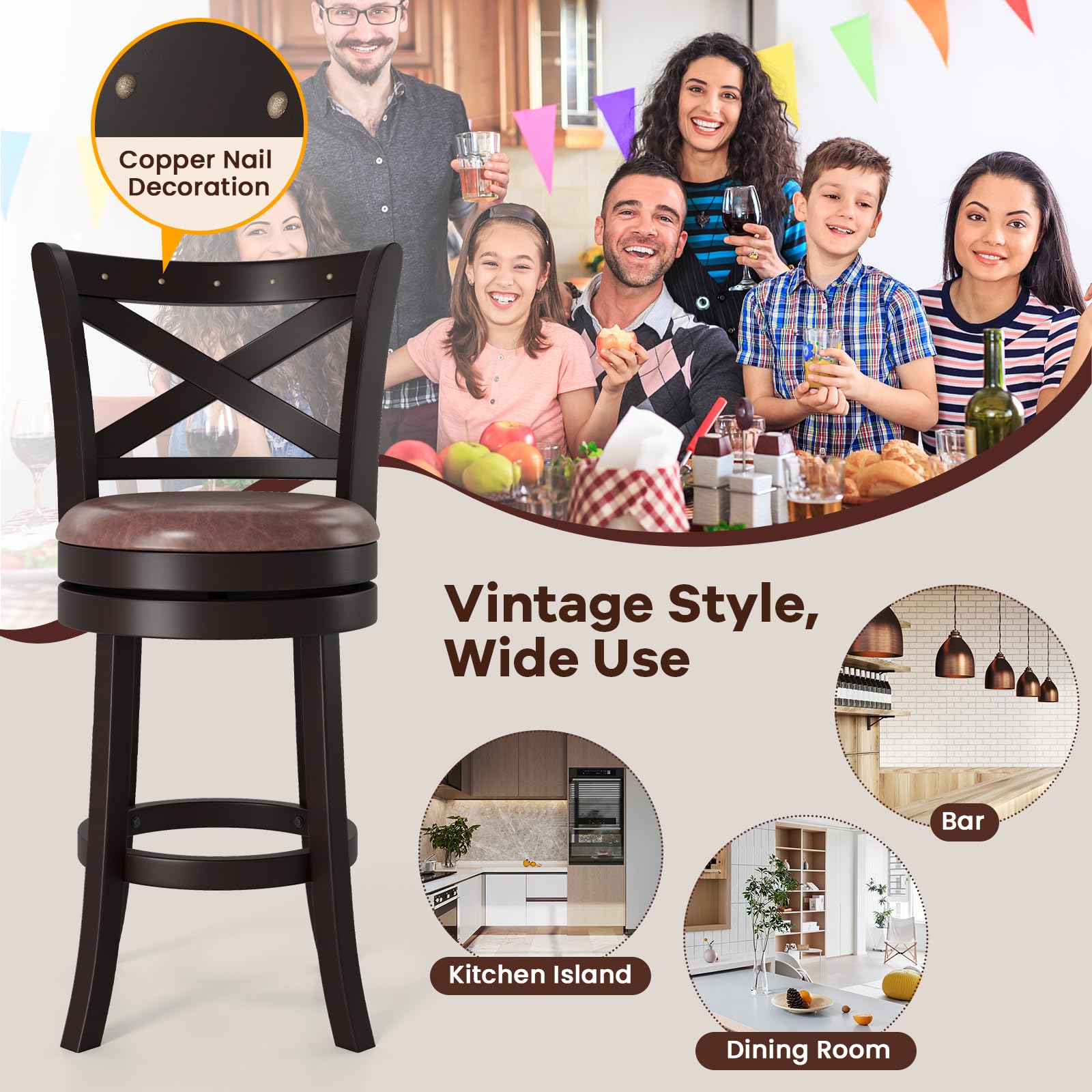 Indulge in ultimate relaxation with our bar chairs set of 2! These swivel bar chairs are sure to surpass all your expectations with their 360° swivel feature, allowing for effortless turning. Experience ultimate comfort with the softly sponge cushioned seat covered in deluxe leathaire material. Additionally, the ergonomically curved backrest supports your back comfortably, while the robust footrest offers a stable place to rest your feet. Constructed primarily from solid rubber wood, each stool can support up to 220 lbs. Enhanced with an X-shaped back and ornate copper nails, these vintage-style bar chairs add a sophisticated flair to any room.