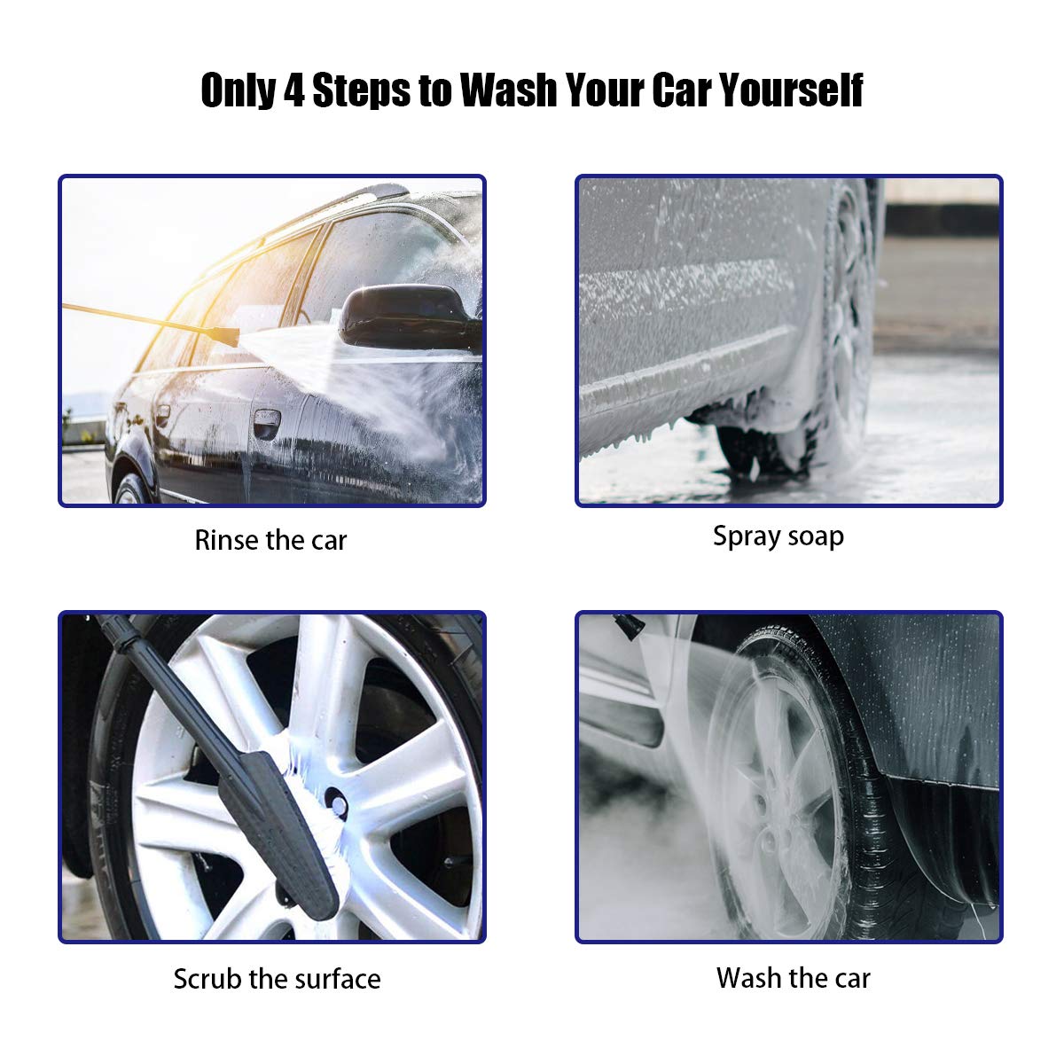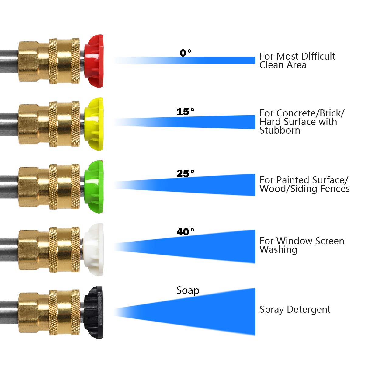 - 【5 Replaceable Nozzles】This pressure washer comes with 5 interchangeable nozzles(0°,15°, 25°,40 °, and liquid soap), allowing you to change the spray width or mode for different cleaning task.