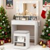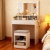 Includes a vanity stool, and features a shelf with adjustable height to provide additional storage space