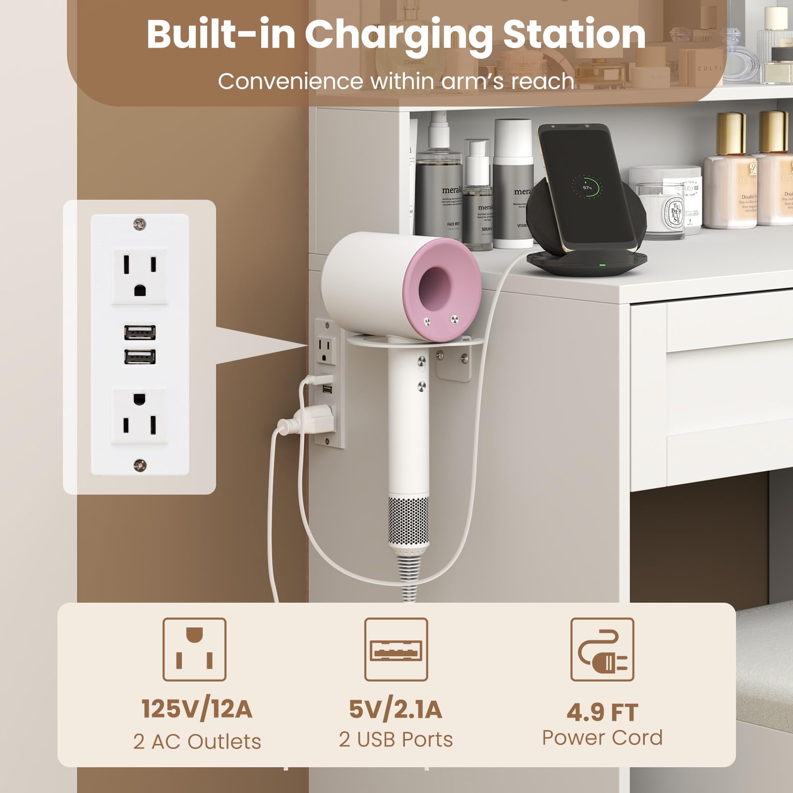 Integrated electrical outlets and USB charging ports keep devices powered and cords neatly organized