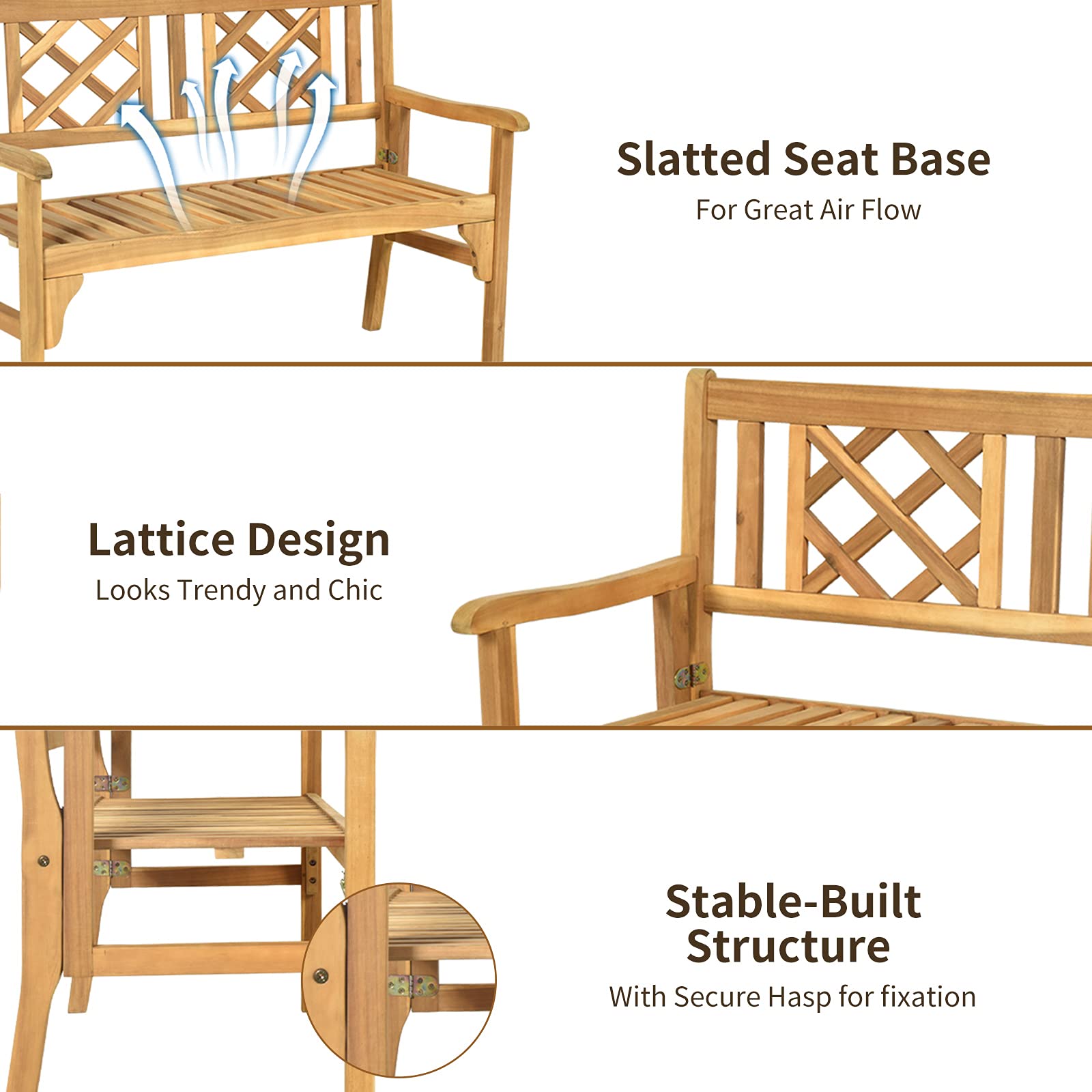 Constructed from premium acacia wood, this durable bench boasts a sturdy frame for long-lasting use. Its spacious seating area comfortably accommodates two people, while the ergonomic design ensures optimal comfort. The slightly sloping backrest and wide armrests provide a relaxing sitting experience. Featuring a user-friendly folding design, this bench allows for effortless movement and storage. Enjoy the perfect blend of durability, comfort, and convenience with this stylish and versatile acacia wood bench.