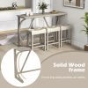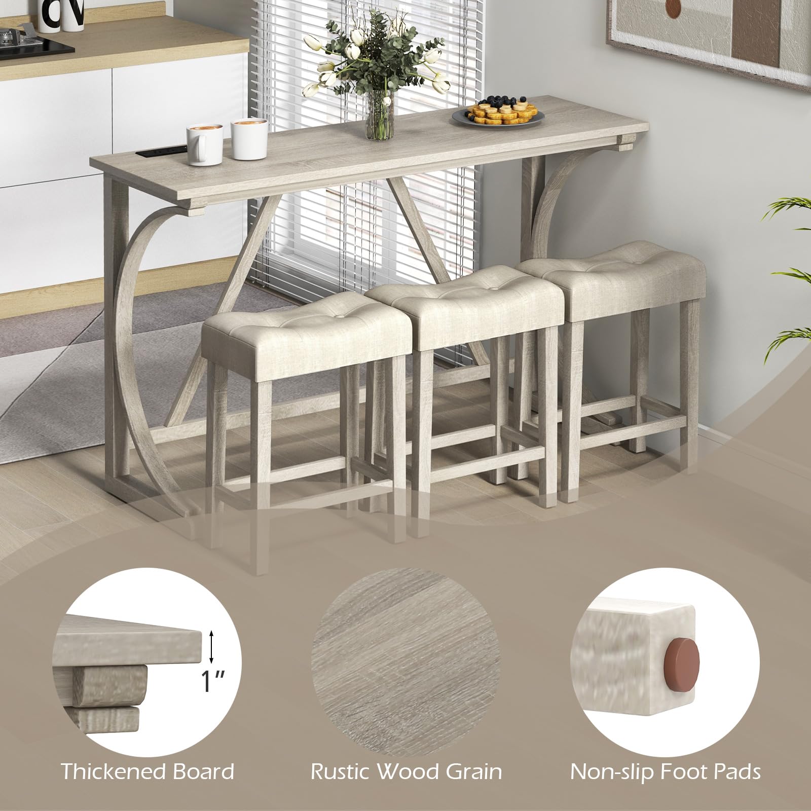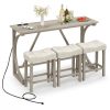 The counter height table features a built-in power outlet, perfect for charging devices while enjoying a meal. Accompanied by 3 upholstered stools, this bistro table set offers superior comfort and convenience. The spacious tabletop allows for easy placement of dishes, while the stools tuck neatly underneath to maximize space efficiency. The set's sturdy wooden construction promises long-lasting reliability. Whether setting up a cozy dining space in the kitchen, adding extra seating in the living room, or creating a casual nook in your dining room, this versatile table and stools set adapts to your needs.