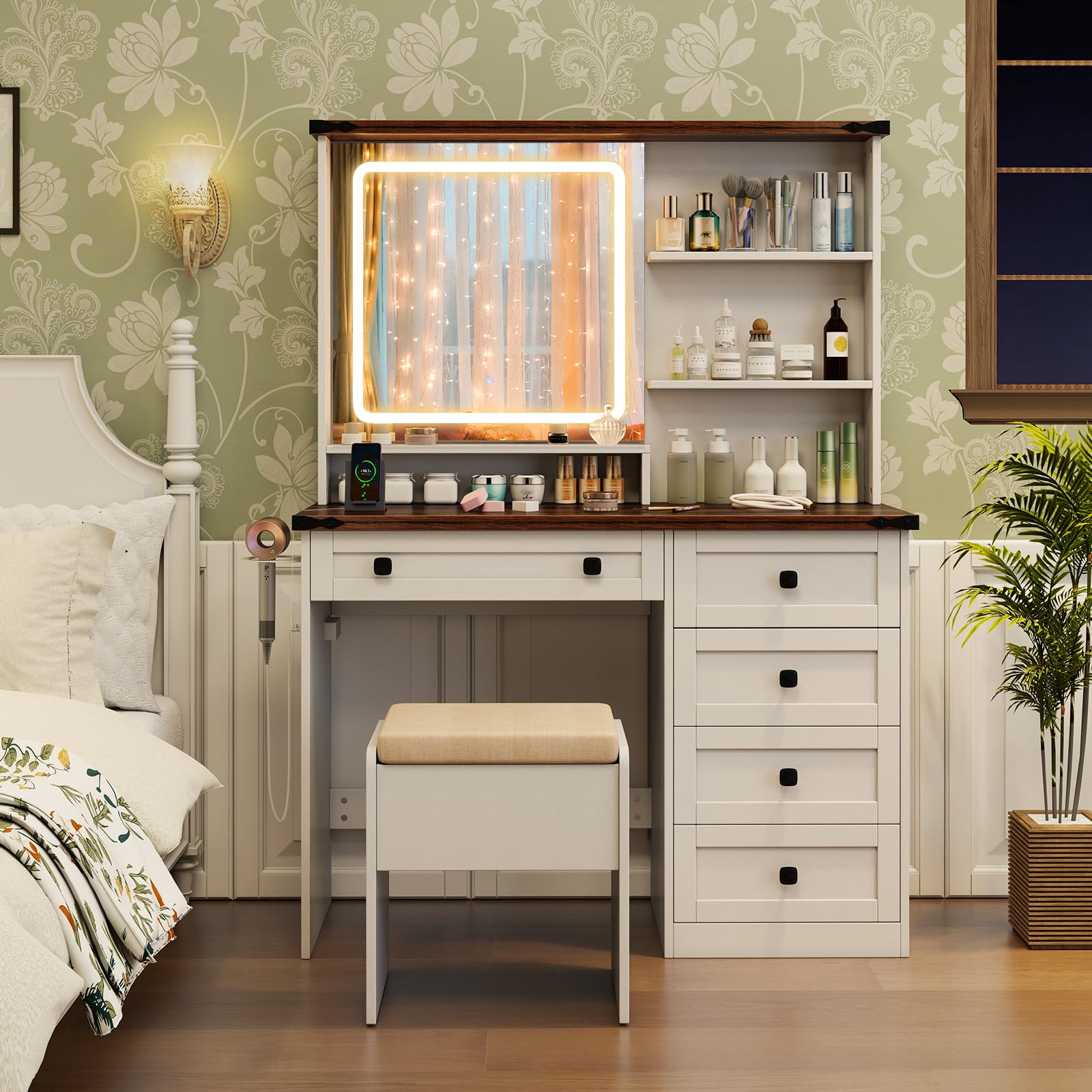 Transform your bedroom into a cozy sanctuary with our stunning farmhouse vanity set, meticulously crafted to blend rustic elegance with the modern conveniences you crave. This isn't just a vanity; it's your complete beauty and organization command center.
