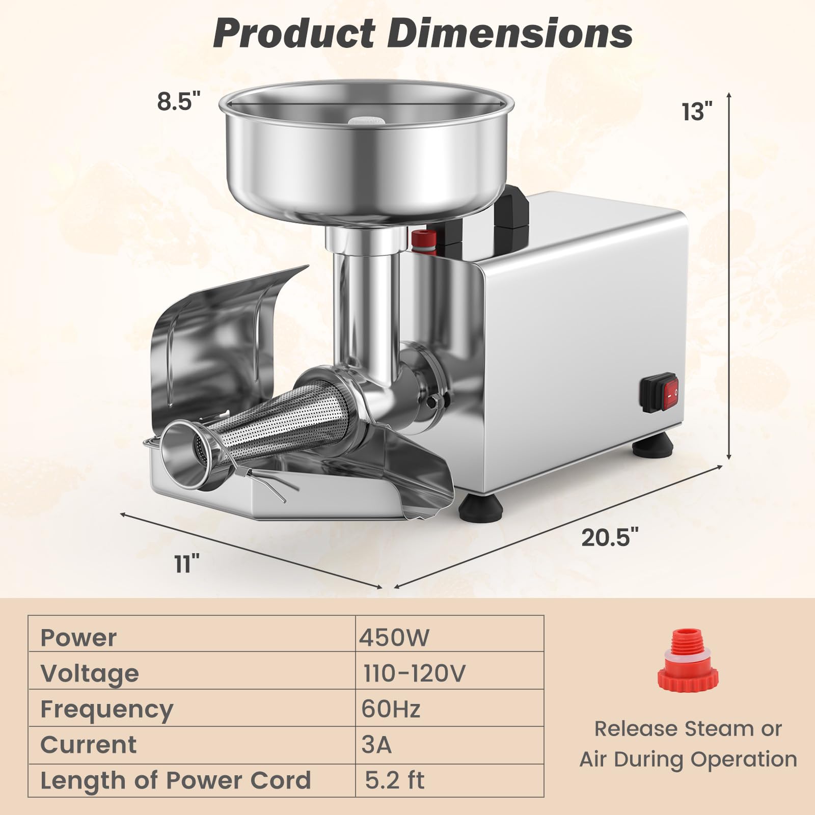 Produce up to 200-350 lbs of jam per hour with a 450W pure copper motor
