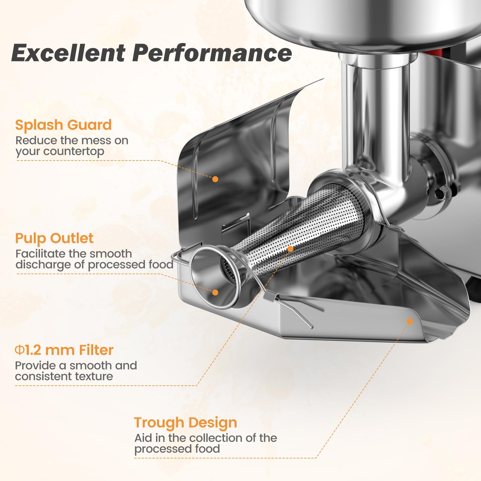 This electric food mill efficiently processes a variety of fruits from tomatoes to blueberries, handling 200-350 lbs of produce per hour. In addition, this electric tomato strainer, crafted from food-grade 304 stainless steel, ensures durability and easy maintenance with detachable parts being dishwasher-safe. Designed with your safety in mind, it features a fully enclosed motor guard, anti-slip feet and a waterproof switch. Adding to the user-friendly experience, it includes a practical pusher and an adjustable trough design to enhance the handling and gathering of processed foods