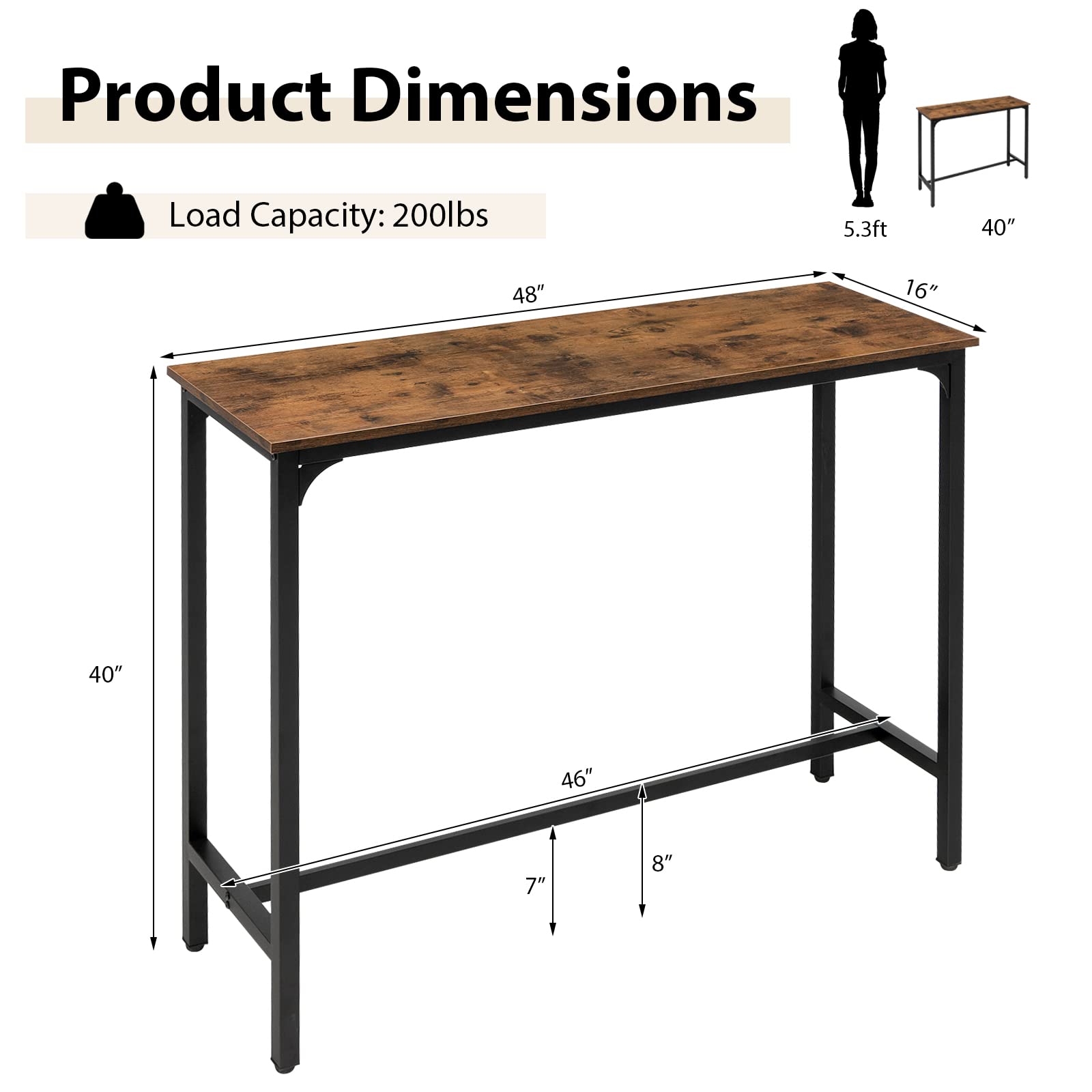 Thanks to the steel frame with 4 triangular steel blocks, the pub table features a strong load capacity of 200lbs/91kg and can basically meet almost all daily needs. More, it has 4 adjustable foot pads, so the industrial bar table won’t scratch the floor accidentally. More, the 48”/120cm console table offers roomy space for dining, up to 4 people can sit together. Under the table, a steel footrest is a good place to stretch your legs for better comfort. Finally, the entire assembly is very simple, since the detailed manual will explain each step to you.