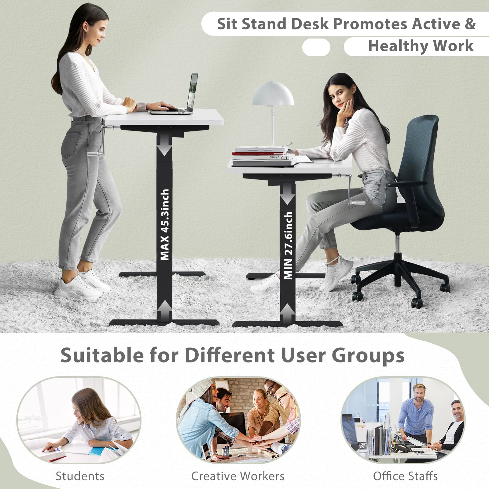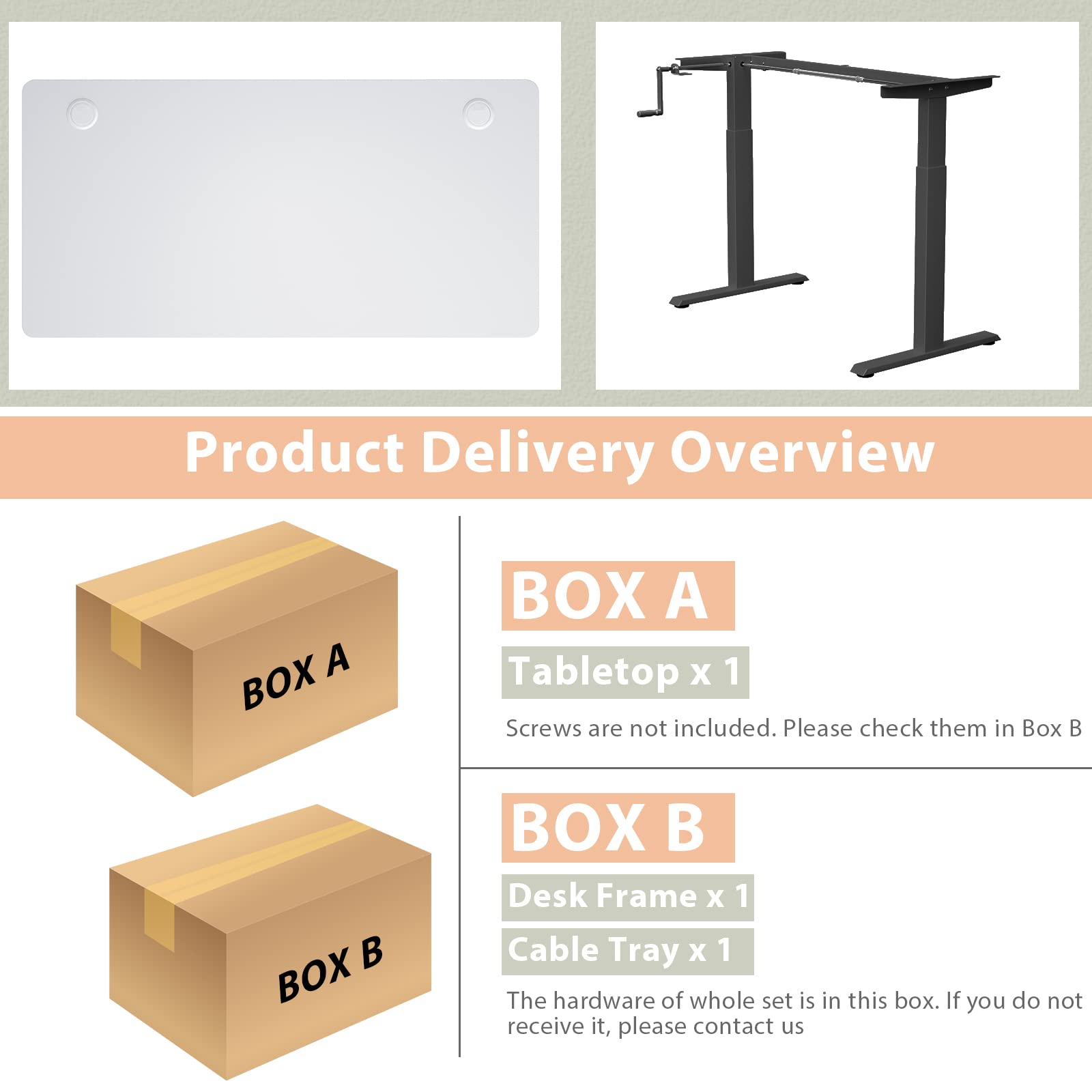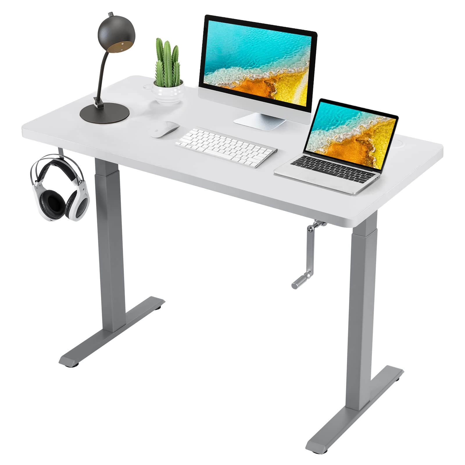 This standing computer desk is designed to give your optimal comfort and improve your working space to the next level. Turning the hand crank, you can easily raise or lower the desk to switch between sitting and standing mode according to your needs. Different people can also find the desired height that suits their requirement. What’s more, the convenient crank can be installed on left or right or folded up to facilitate your use. And when you finish, just fold it back underneath the table to save space. With a large tabletop, the desk can easily support your ideal office supplies for daily working needs. And a side hook is attached to the desk to keep the headphones or bags within your reach. In addition, supported by heavy-duty steel frame, the computer desk is rather stable and durable, and is an ideal choice for home office.