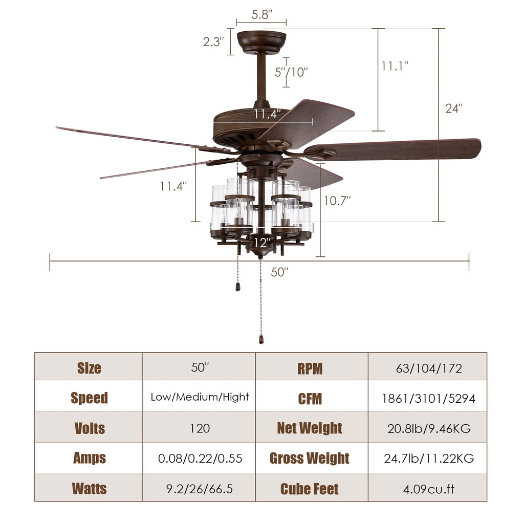 - Premium Material & Sturdy Frame: Combining the traditional fan and beautiful light in one. Our 50’’ ceiling fan with sturdy steel frame and premium MDF blades is durable enough for long-lasting use. With UL and ETL certification, you can use it without worry. The lamp base is E12(bulb excluded).