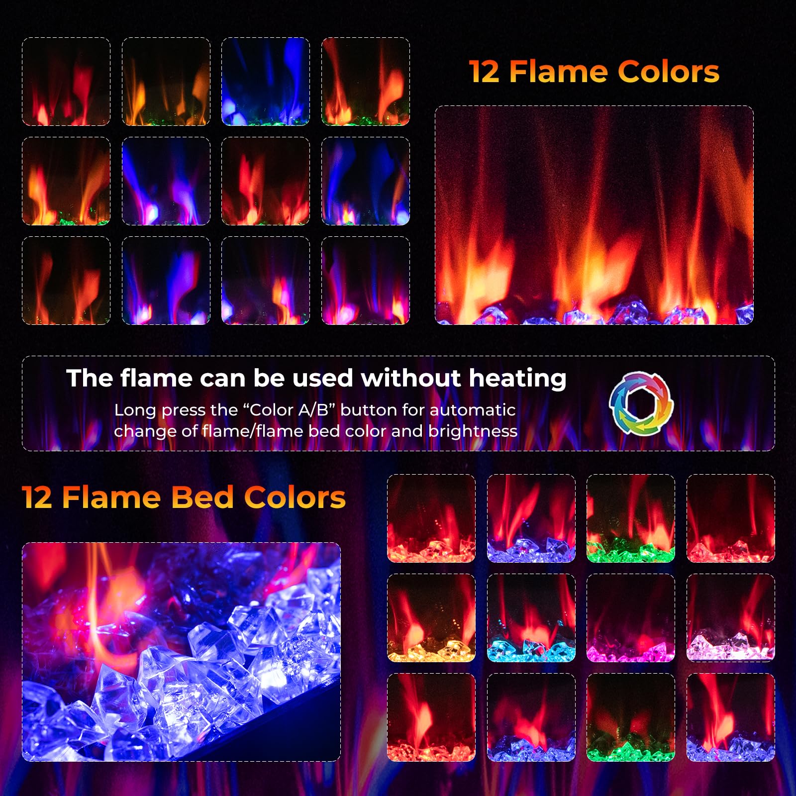 - Rich Color Matching: With 12 adjustable flame and ember bed colors, this fireplace heater allows you to choose a smooth and soft flow or a vibrant and fiery display as you need. And you can set the ideal brightness and speed level from the 5 available options. The flame can be used without heating.