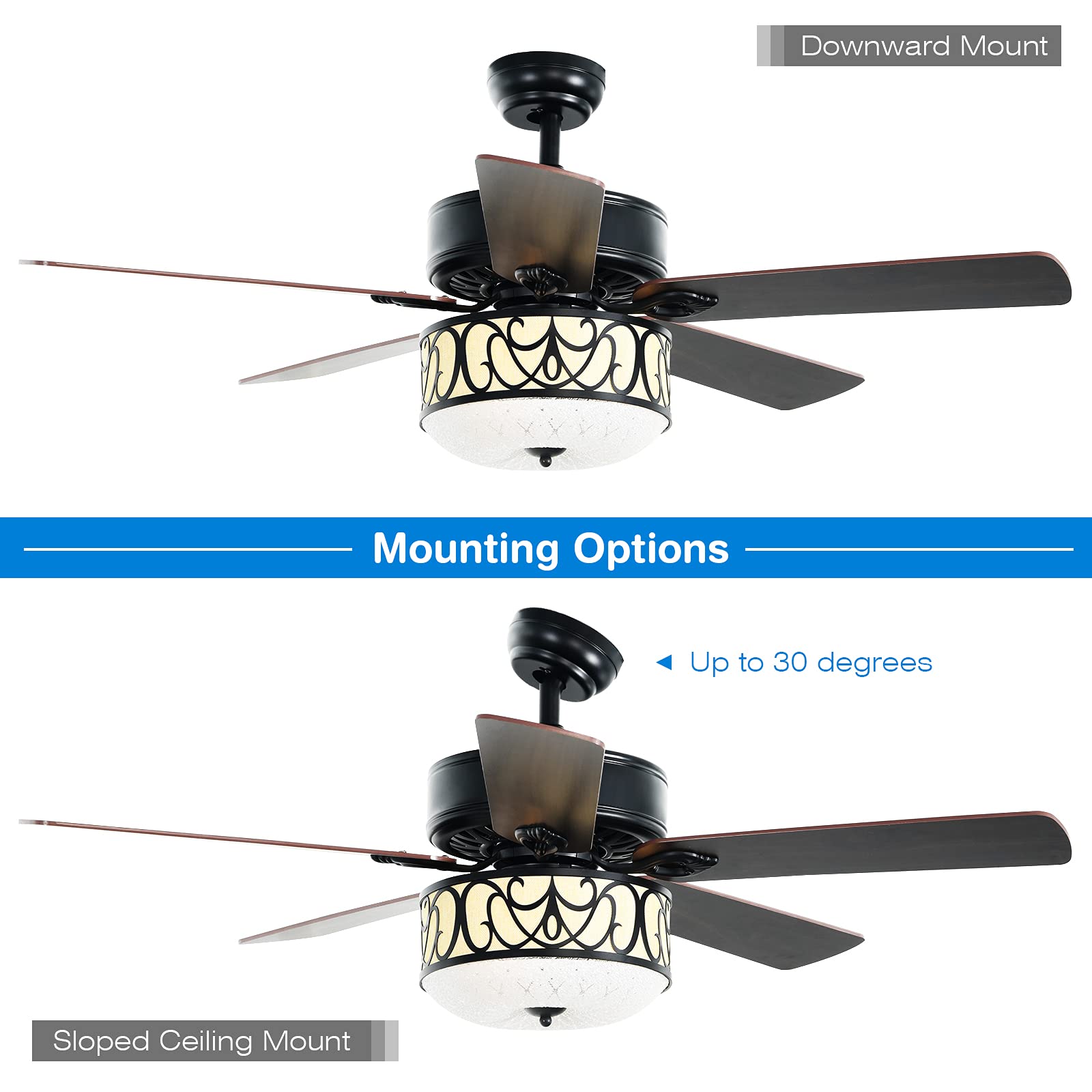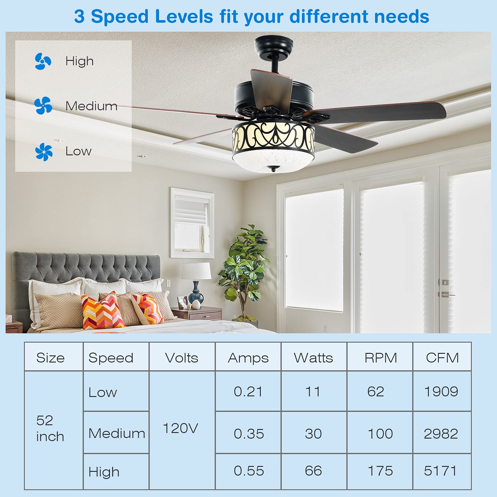 - Premium Materials: Made of solid iron frame, the 5 blades are characterized by great sturdiness and stability, thus ensuring your safety when in use. The curved glass lampshade makes the light more natural and softer, creating a bright and warm condition for you. Here we recommend you to choose the E12 bulbs (not included) for installation and replacement.