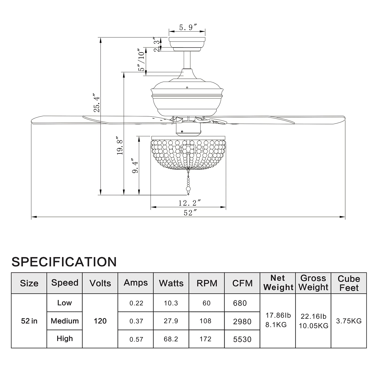 - đăETL CertificationăThis 52ââ ceiling fan is fully certified by ETL for safe use. Furthermore, the premium iron frame is durable and stable for a long service time. And detailed instruction will help you to install it.