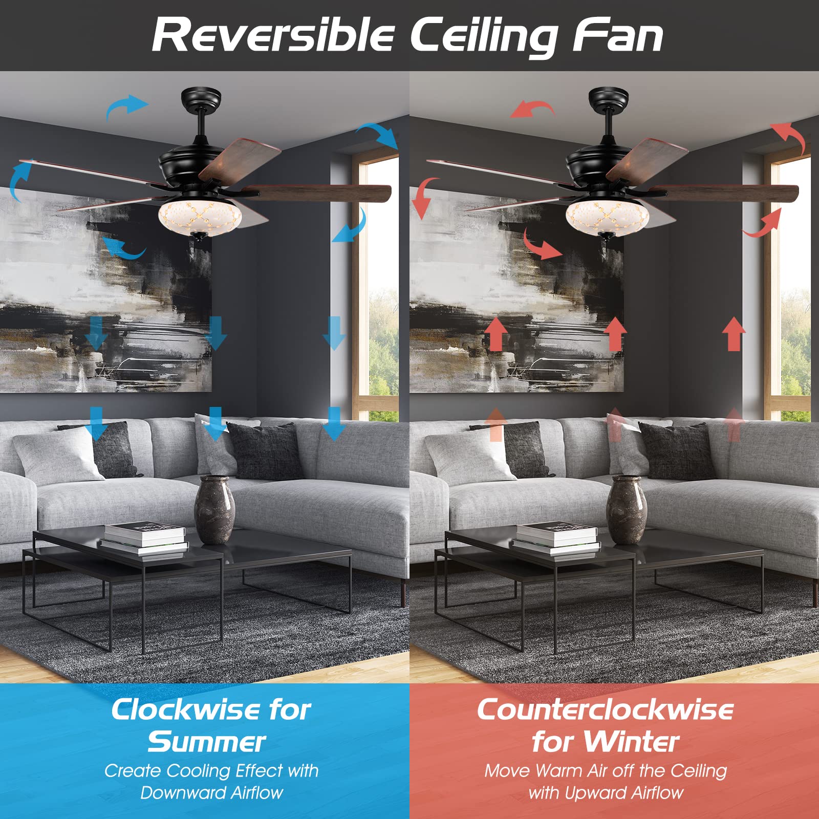 - Reversible Motor: Equipped with a reversible and powerful motor, this indoor ceiling fan not only allows you to use it both summer and winter, but also provides quite operation. Through the reversible button, this ceiling fan can run clockwise for summer to create a cooling effect with downward airflow. And it can run counterclockwise for winter to move warm air off the ceiling with upward airflow.