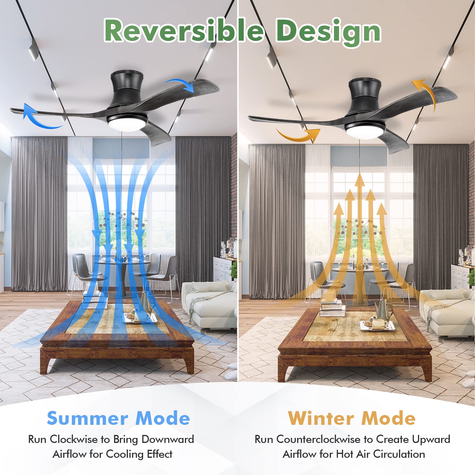 - 【Not just for Summer 】Apart from running clockwise to bring downward airflow for a cooling effect in the summer mode, the reversible design endows this ceiling fan with winter mode as well, running counterclockwise to create upward airflow for hot air circulation.