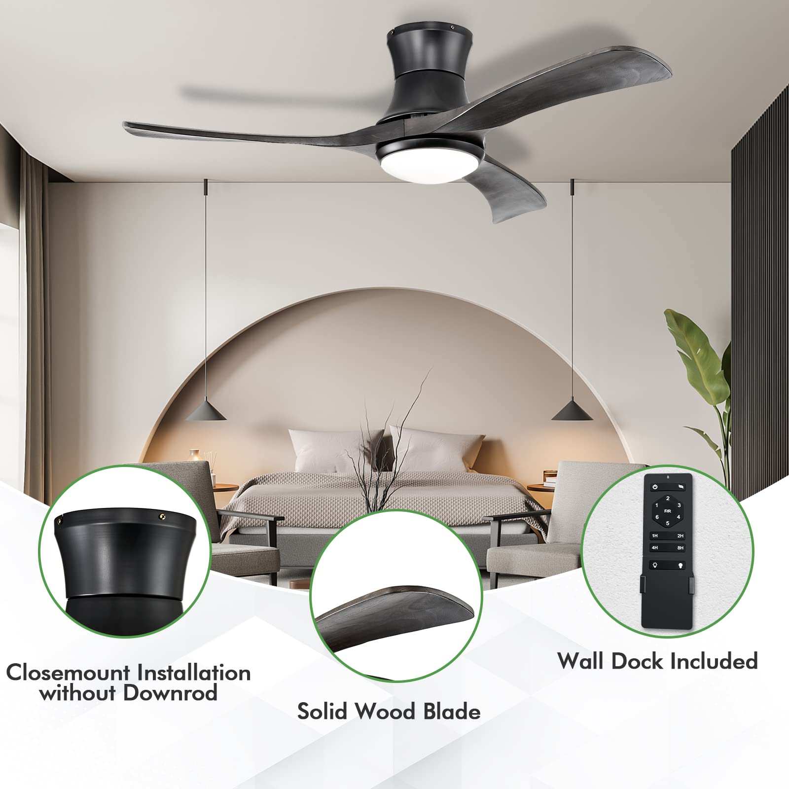 - 【Powerful DC Motor】This flush mount ceiling fan is equipped with a powerful yet quiet DC motor that not only creates 6 wind speeds for you to choose from but provides you with a quiet environment that is perfect for working and sleeping.
