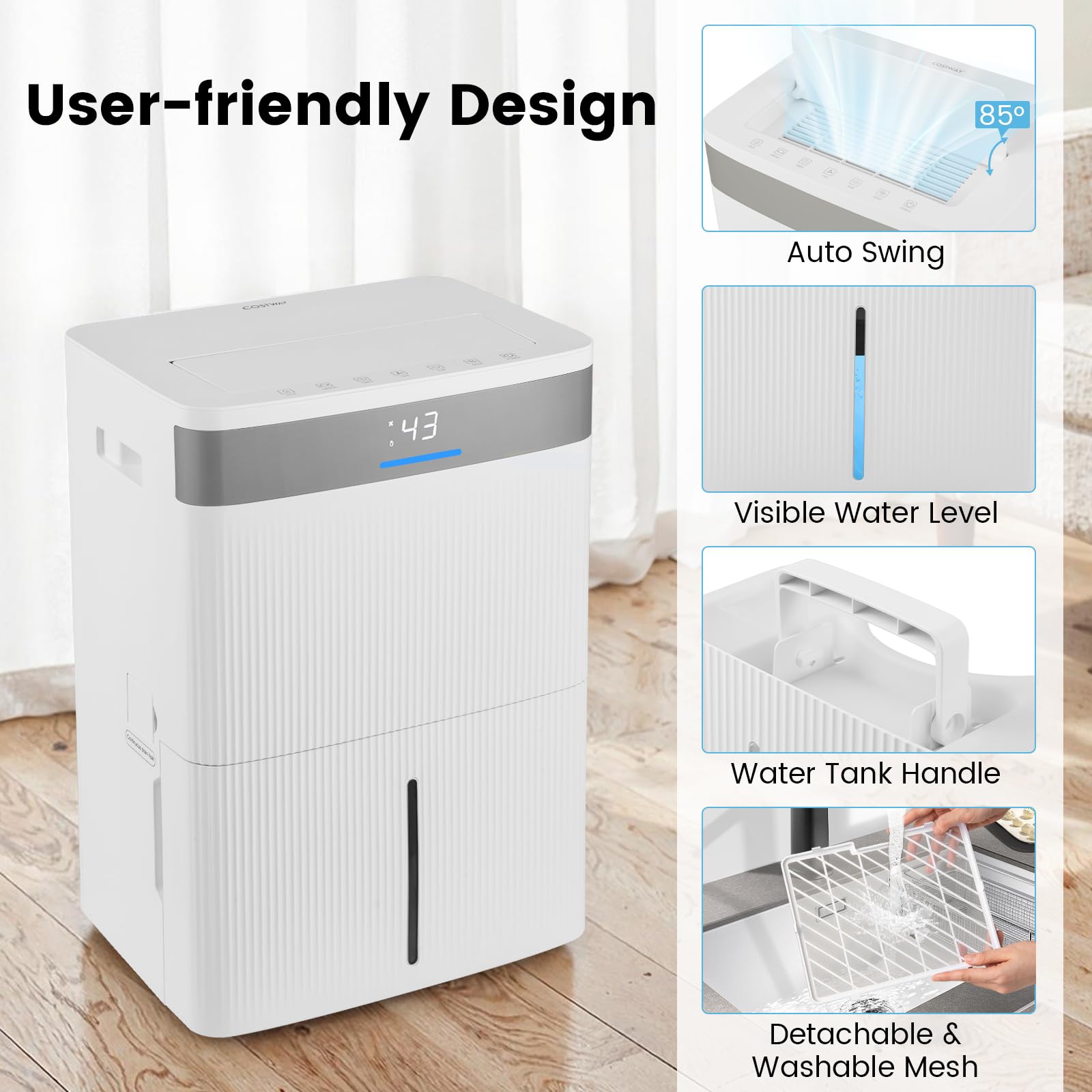 Covering a large area of 5500 sq.ft and capable of removing 96 pints of water per day at 95℉, 90% RH, this dehumidifier will be an excellent solution for humidity control in your home or basement. It features 3 working modes, 2 fan speeds and allows you to set the desired humidity level from 30-80%. The quiet sleep mode combined with a 0-24 hour timer supports undisturbed sleep. With user-friendly controls like the smart touch panel, a 3-color humidity indicator, and a child lock, the dehumidifier is both simple and secure to operate. As for drainage, there are 2 options for you to choose from: manual or continuous drainage.