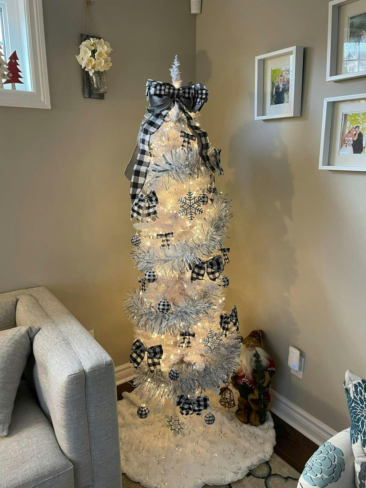 Wishing you have a peaceful and happy time during the Christmas season. Our slim white Christmas tree is an eye-catching decoration for celebrating the coming festival. Its dense tree shape and unique white color attract people’s mind at sight. Equipped with 340 premium PVC branch tips, this pencil tree creates lifelike looking and lush appearance. Supported by sturdy metal stand, this realistic pine tree can stand uprightly without tipping over. Since the folding design of bottom stand, you can store the tree in a bag effortlessly. Also, the slim tree shape with small footprint can be placed in all occasions. The white Christmas tree shows strong festival vibe and romantic snowy feeling for holiday celebrating and cheers spreading.