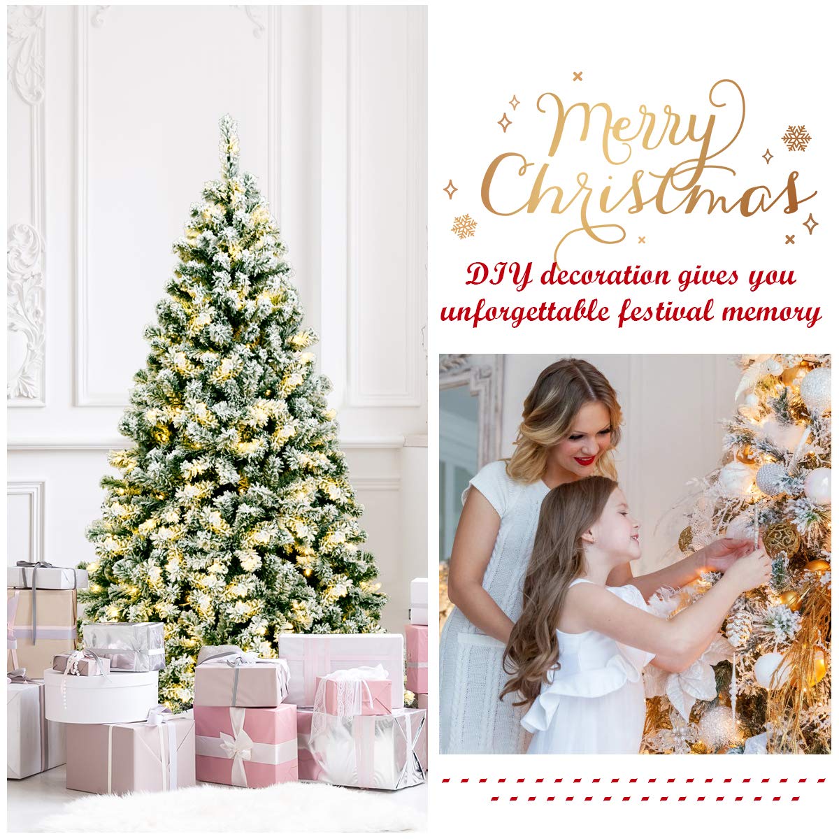 Transform your living room into a unique winter wonderland with our pre-lit snow flocked Christmas tree. The tree, crafted with 928 branch tips and snow flocked leaves, is leafy and elegant. It will give you the illusion of a full-bodied genuine tree. Made of high quality PVC material, these snow flocked leaves with exquisite craftsmanship will not fall off or fade easily, ensuring long term use. 250 warm LED lights hanging on the branches will bring a festival glow to your home. Supported by sturdy metal stand, this artificial Christmas tree will keep standing upright for years to come. At the same time, the metal stand is foldable to facilitate storage. All hinged construction makes the artificial tree easy to set up and fluff. In addition, this Xmas tree can be divided into 3 sections and placed in a storage bag for future reuse easily. With its eye-catching appearance, this snow flocked Christmas tree will definitely be a glamorous decoration for any place.