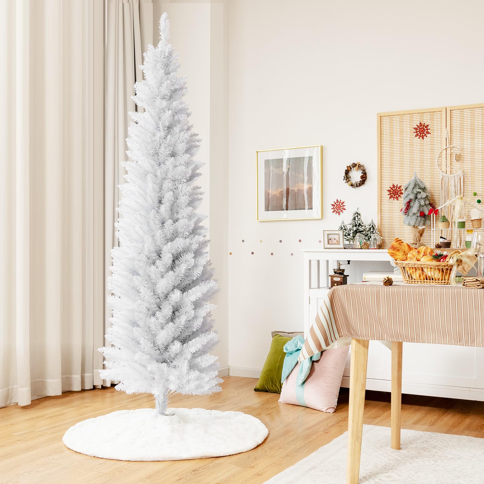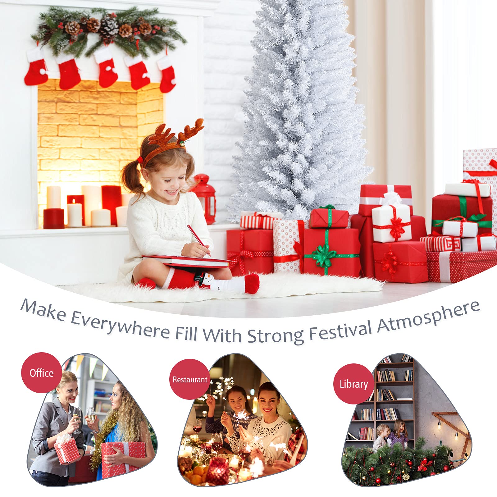 Wishing you have a peaceful and happy time during the Christmas season. Our slim white Christmas tree is an eye-catching decoration for celebrating the coming festival. Its dense tree shape and unique white color attract people’s mind at sight. Equipped with 436 premium PVC branch tips, this pencil tree creates lifelike looking and lush appearance. Supported by sturdy metal stand, this realistic pine tree can stand uprightly without tipping over. Since the folding design of bottom stand, you can store the tree in a bag effortlessly. Also, the slim tree shape with small footprint can be placed in all occasions. The white Christmas tree shows strong festival vibe and romantic snowy feeling for holiday celebrating and cheers spreading.