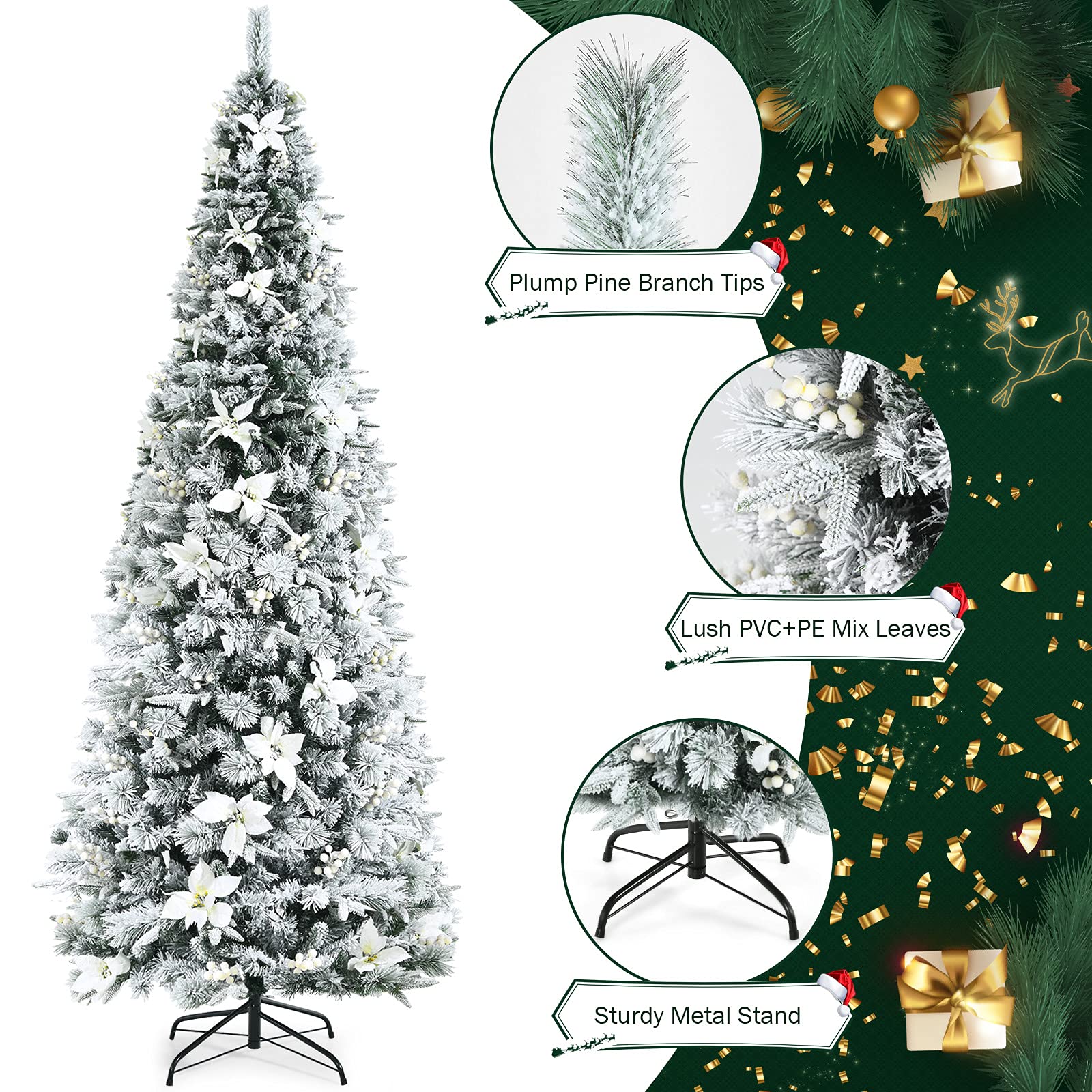 Our 8FT Snow flocked artificial Christmas pencil tree features 807 delicately crafted branch tips, which can add a warm, festival feeling to any setting. And pre-decorated with pure white berries and lily-white flowers, the tree is suitable for the Christmas season and looks beaming with charm. Supported by a sturdy foldable metal stand, this Christmas tree will keep upright and endure many holidays. And there is no need to worry about installation and storage for it is fairly easy for anyone to assemble the Christmas tree thanks to the convenient hinged design. Welcome this classic unlit tree into your home and bring cheer and laughter to you and your family!