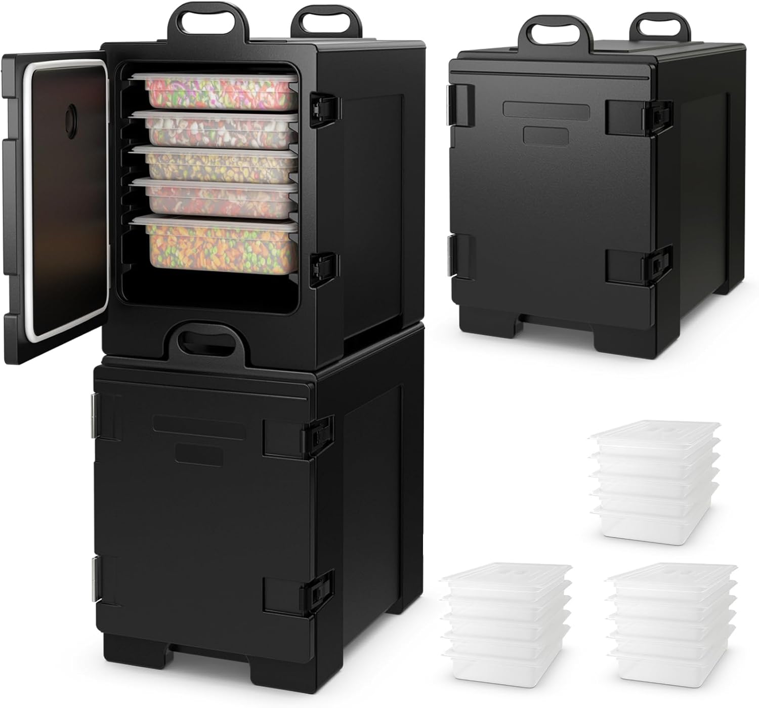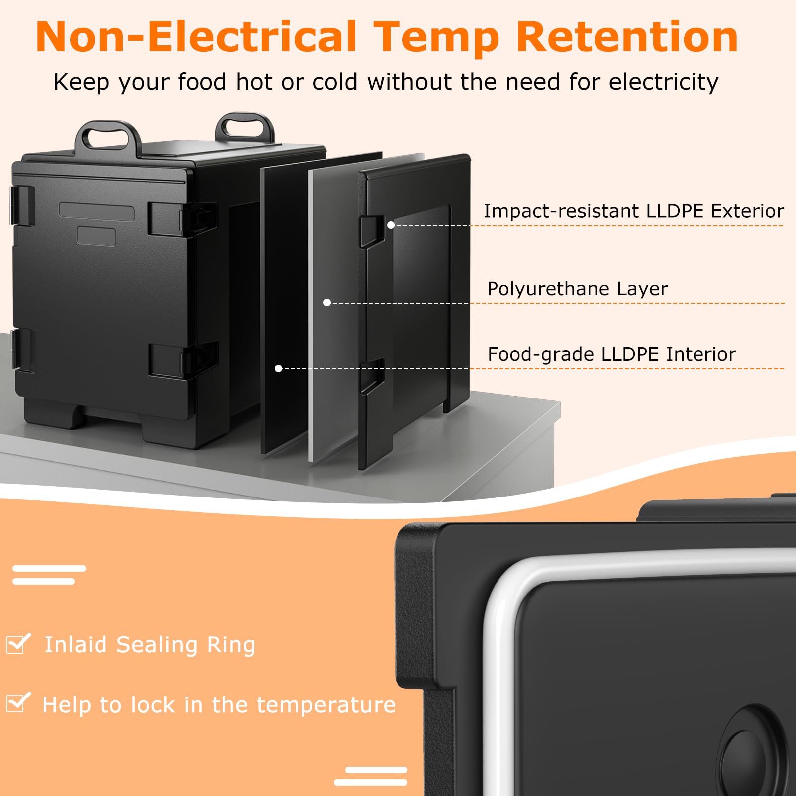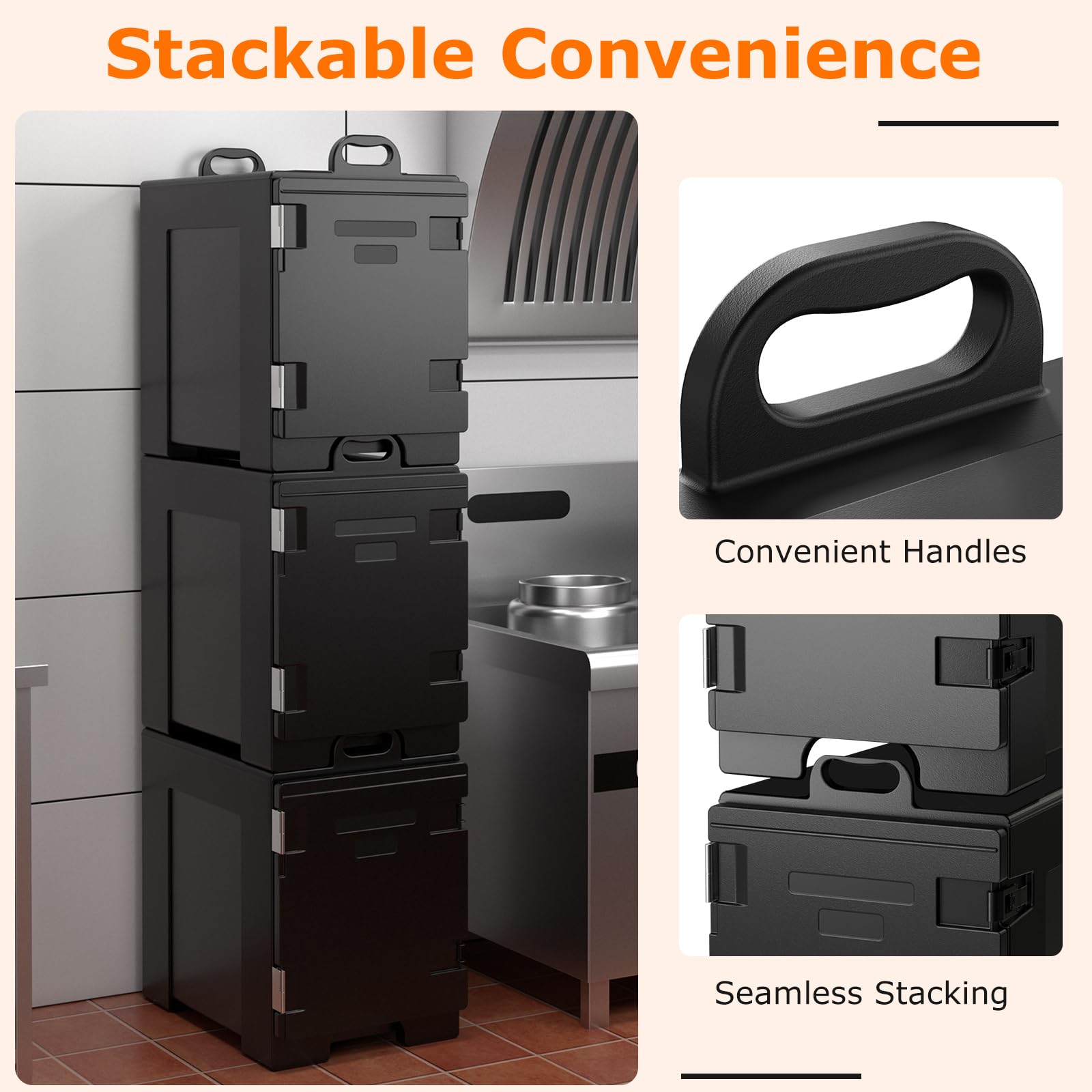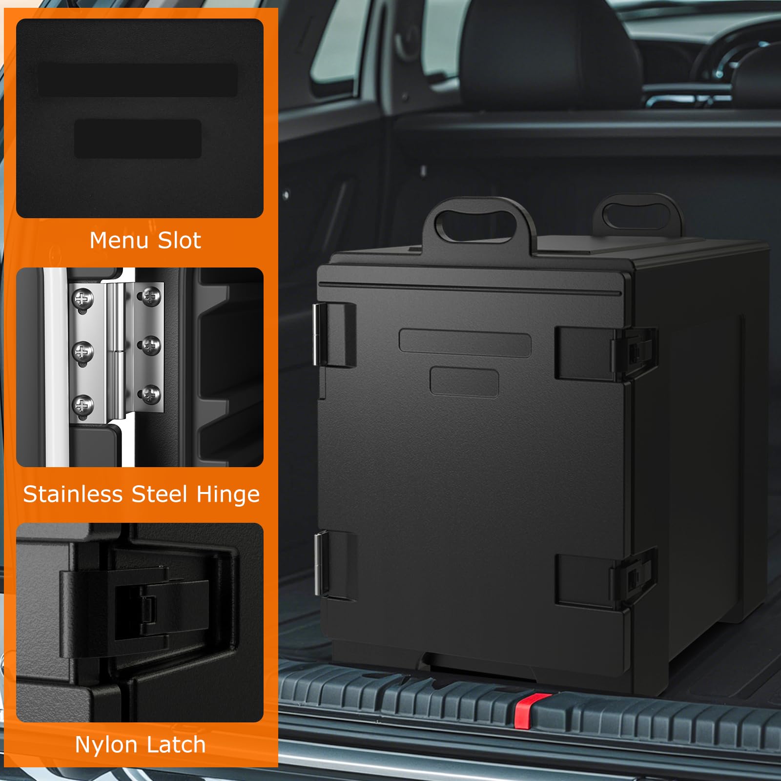 Designed to maintain optimal temperature for 4-6 hours with its 3-layer insulation and sealing ring, this food carrier maximizes efficiency without the use of electricity. It comfortably fits an array of dishes with the capability to hold four 2.5” deep pans and one 4” deep pan, all included. Transport is a breeze with its convenient handles and stackable design, providing space-efficient storage and ease of movement. Additionally, this food warmer box comes with handy menu stickers, extra nylon buckles and stainless steel hinges, ensuring that you’re always prepared to serve your food hot or cold, just the way it should be.