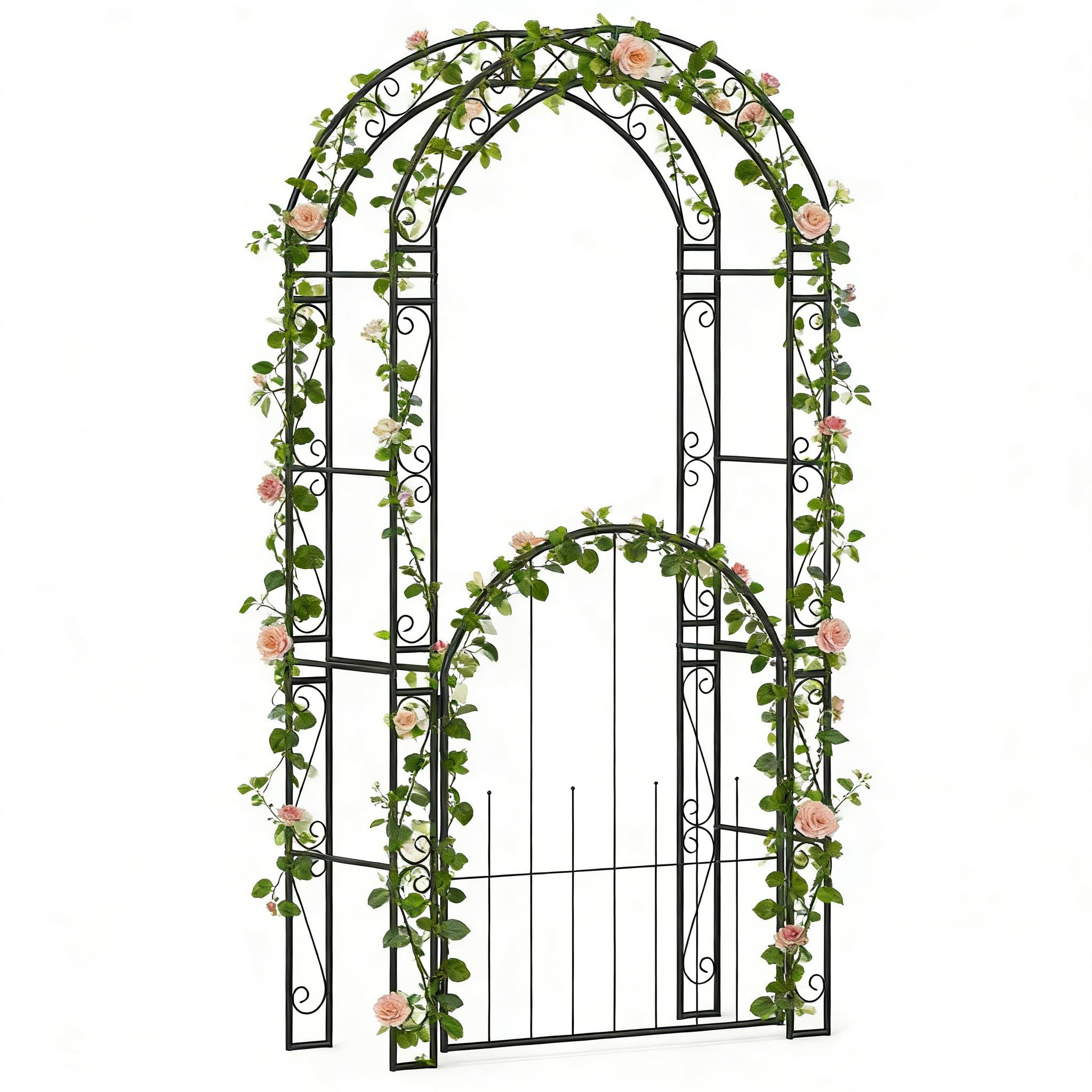 Constructed with a strong powder-coated metal frame, this decorative archway is built to withstand outdoor elements while maintaining its elegant appearance year after year. The dual-side trellis panels provide reliable support for climbing roses, vines, and flowering plants, encouraging lush vertical growth. Moreover, its generous height and timeless decorative patterns make it a striking feature for weddings, garden walkways, and special occasions. The integrated lockable gate adds both charm and functionality, giving each entrance a welcoming yet private feel. Whether used as a romantic ceremony arch, a stylish backyard gateway, or a permanent garden accent, this arbor enhances any outdoor setting with structure and sophistication.