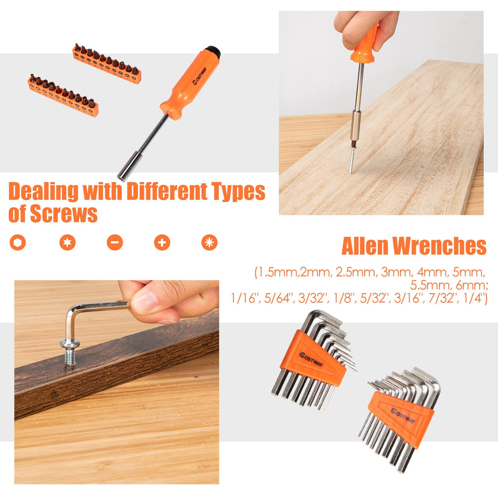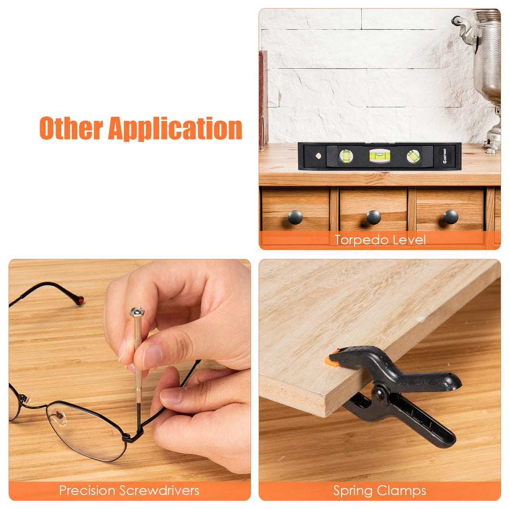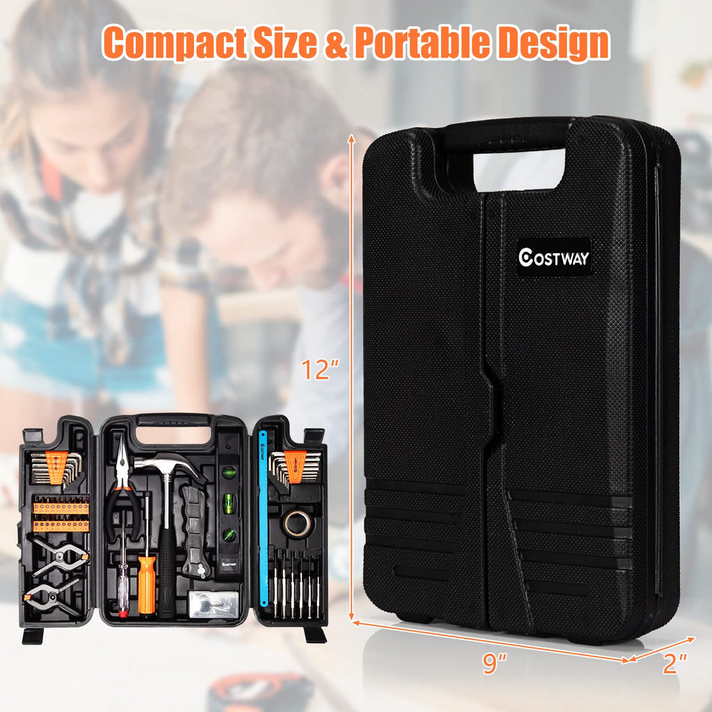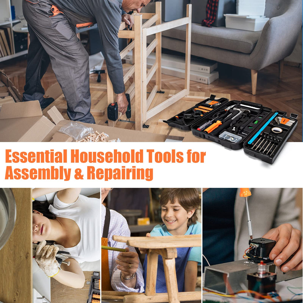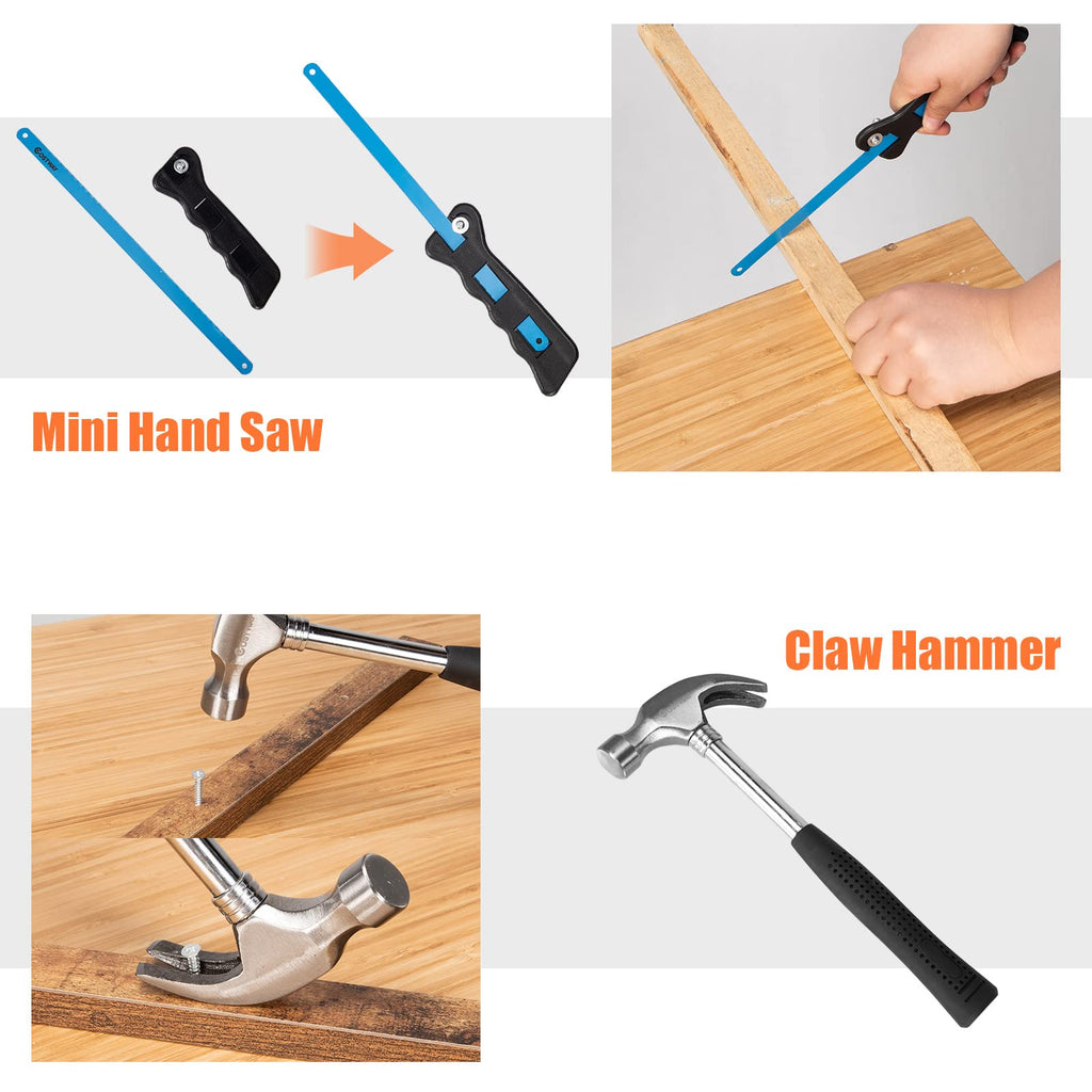 This comprehensive household tool kit can cover all your daily repair needs! When it comes to carpentry, there is a claw hammer, a mini hand saw, spring clamps and nails for small handcrafts. Screwdrivers with different heads and hex wrenches of different sizes can help you when you need to assemble or disassemble projects. And the long nose plier, test pen, and insulation tape are used to dealing with household appliances.
